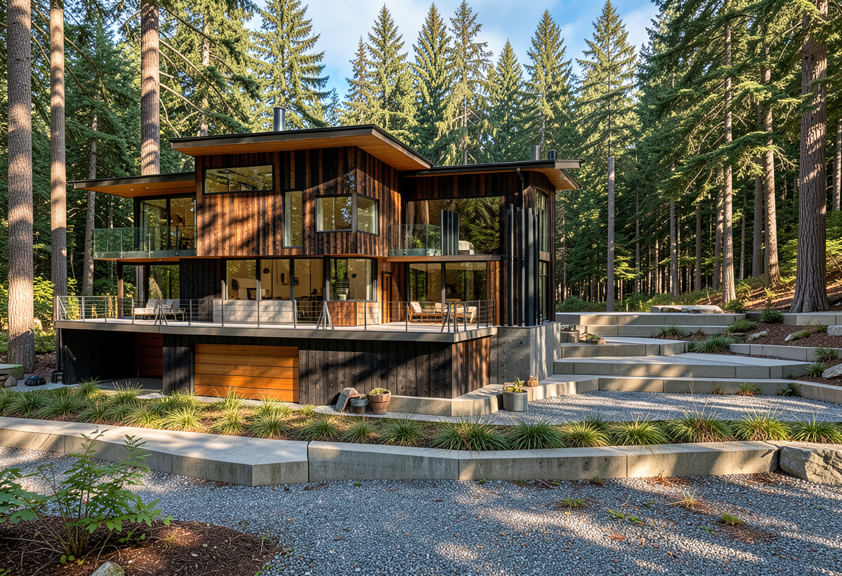 modern west coast house with shou sugi ban charred wood siding in a coniferous forest near seattle