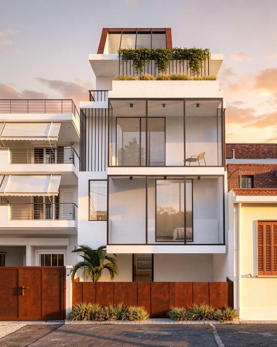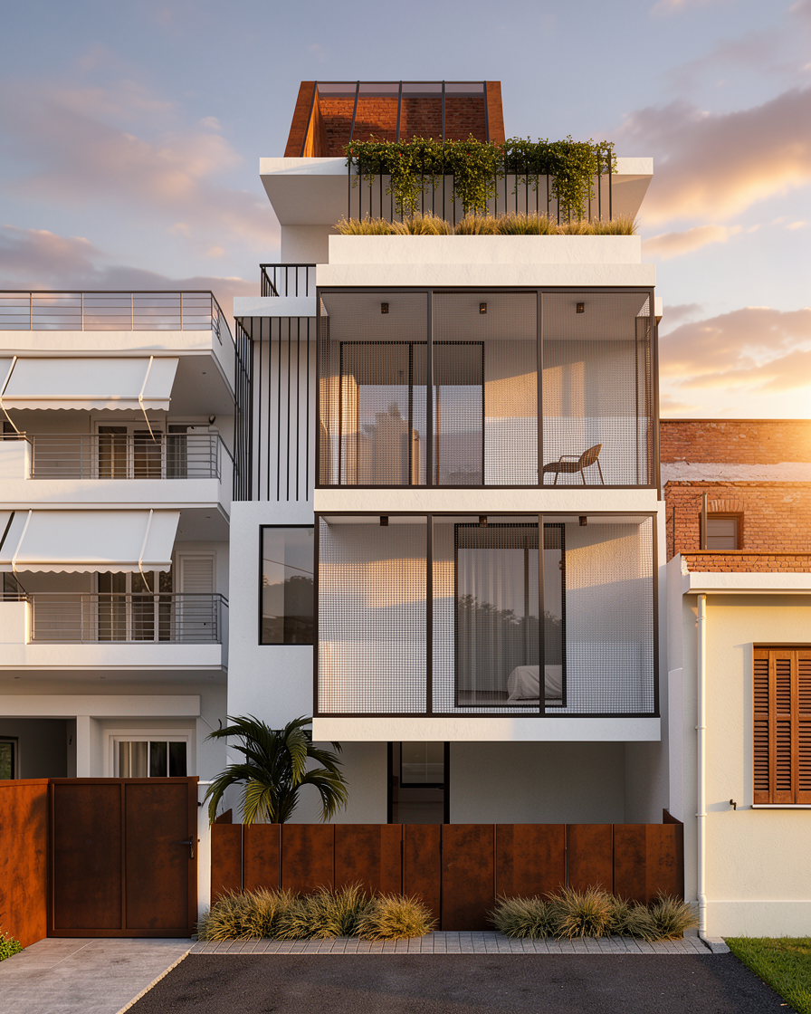 add realism to this image and as for materials in the facade the concrete surface is all the same white solid color not rough its matte and in front of the windows dark color grey close to black metallic frame holding a thin metal grating grill panel and contemporary rust finished corten steel material dark bronze color generic only in the middle entrance gate and give a view in a warm sunset about serene atmosphere not many clouds return the entrance gate to the left in its original grey color and shape