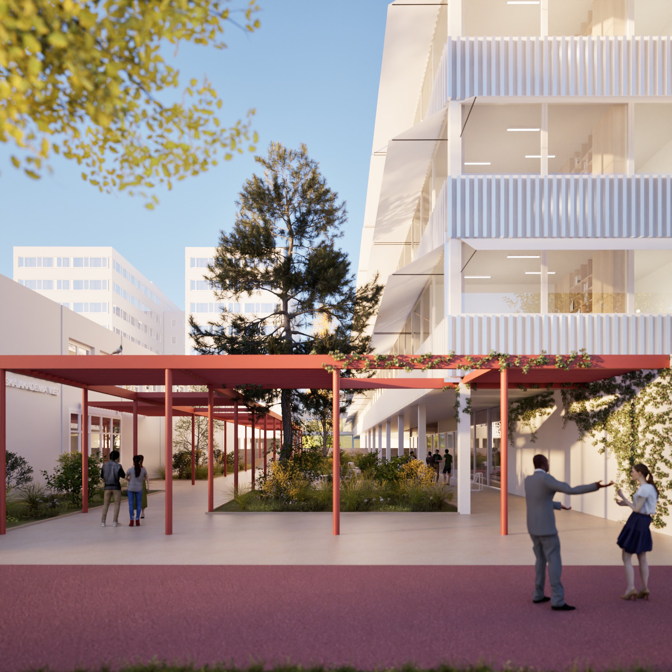 facade on right building in striped metal soft gloss red front part of the sidewalk in antuka material more realistic leave the geometry of the original make people and plants more real light in windows some clouds
