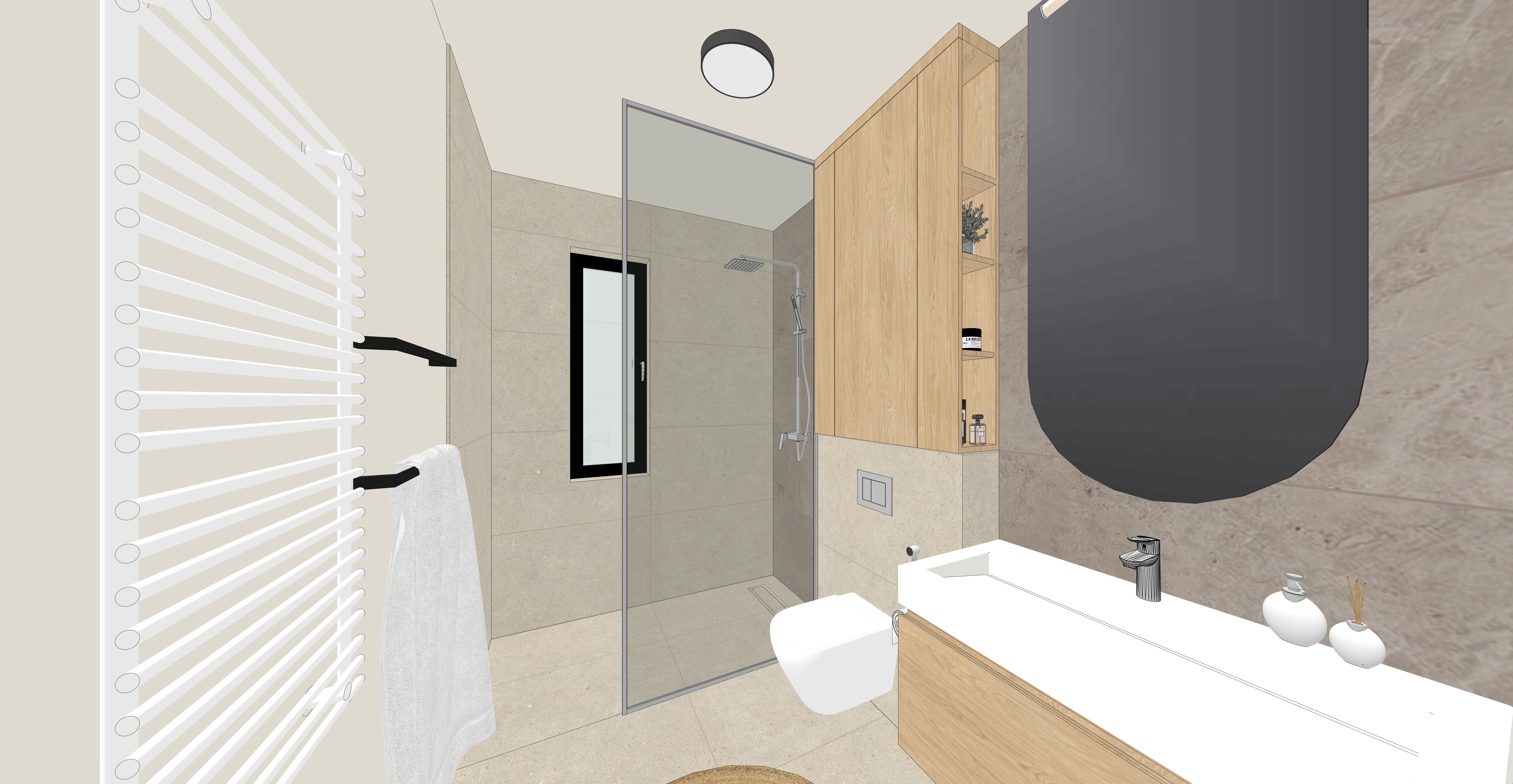 act as a world class architectural visualizer and 3ds max corona renderer master i am providing an image of a 3d bathroom scene i need you to generate an ultra photorealistic architectural render based exactly on this geometry and layout do not change anything in the scene preserve exact layout proportions camera angle materials object placement and composition materials strict preservation ceramic tiles on walls and floor natural beige stone look subtle texture variation keep all grout lines visible correct spacing and slightly darker than tiles wooden vanity and cabinet with natural wood grain soft matte finish realistic imperfections entrance door in white matte paint flat finish no gloss preserving exact vertical line detailing panel pattern as in the original 3d model the left wall must be preserved exactly as in the original image light greige color warm beige grey matte paint finish no added elements ceiling must be light greige same tone family as left wall smooth matte finish uniform color all metal elements must be chrome sink faucet shower system toilet flush plate accessories physically accurate reflections slightly imperfect the metal towel hangers in the left are black matt shower screen must be clear transparent glass not frosted with realistic reflections refraction and subtle edge highlights the grey element with rounded bottom edges above the sink is a mirror not a solid panel reflective surface slightly imperfect with subtle distortion and realistic reflections of the space object details strict preservation hygienic shower bidet spray positioned to the right of the toilet must be present chrome finish flexible hose correctly mounted and proportioned lighting very important warm led backlight behind the mirror 2700k 3000k soft halo glow on wall neutral ceiling light 4000k diffused and even mirror light fixture emitting warm light slightly stronger contrast vs ceiling light physically accurate global illumination corona style realistic light bounce soft contact shadows natural falloff realism details subtle roughness variation on ceramics micro imperfections on wood grain slight unevenness chrome with realistic reflections not perfect mirror slightly used look mirror reflections must be physically correct include environment reflection no flat shading transparent glass must show realistic thickness reflections and refractions soft ambient occlusion in corners under vanity and near floor accurate contact shadows and edge definition camera render settings eye level perspective same framing as reference realistic exposure balanced whites no overexposed highlights cinematic dynamic range sharp but natural no over sharpening style ultra photorealistic high end architectural visualization corona renderer look clean minimal natural tones no added objects no styling changes no redesign