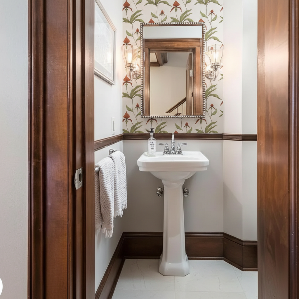make the shower tile off white ceramic and light taupe terrazzo slab flooring and countertop and white oak vanity without hardware and make the fixtures aged unlacquered brass