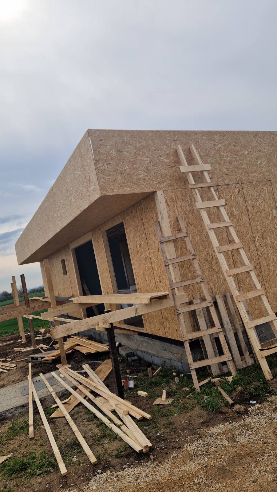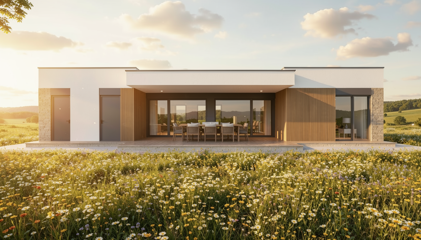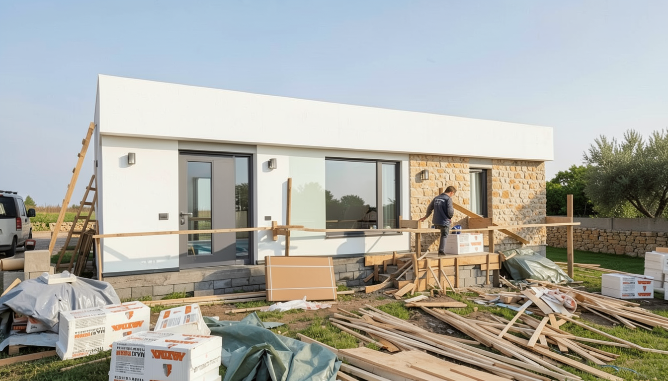 imagine a modern mediterranean house white facade with right side in travertine look anthrazite doors with glass on the side big window it is my summer pool rental house remove all the dirt and the workers keep the original door and window positions imagine beautiful landscape