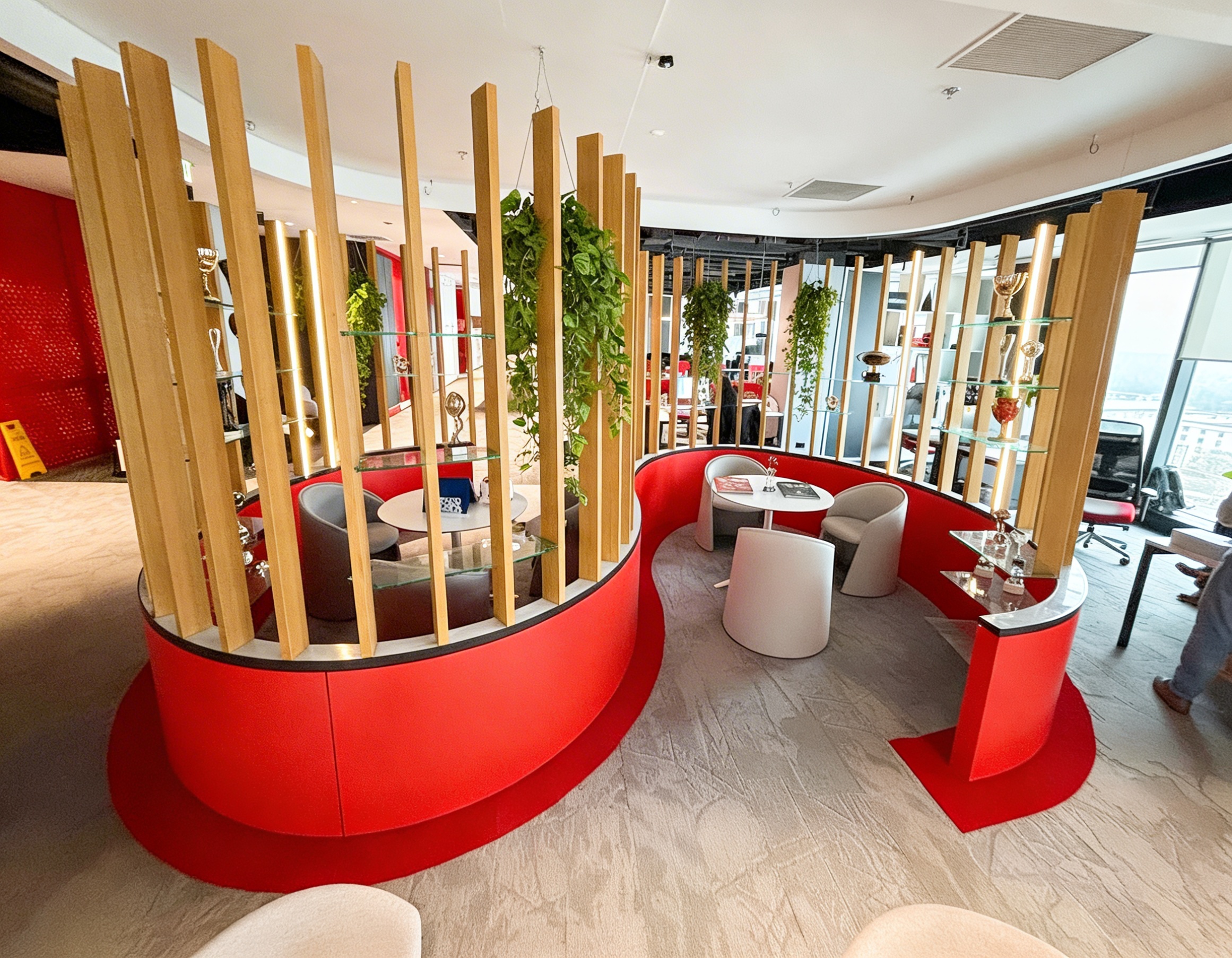 luxury interior design for an office the red parapet stays the s shaped red carpet stays the s shaped black suspended lamp is gone from the parapet to the ceiling there are rifling of wooden texture on all the parapet surface in the middle the rifling are more frequent with hanging plants between them on the ends the rifling are rarer and have vertical led lights strips that emit a warm lights also on the ends there are randomly placed glass and wooden texture shelves with decorations and trophies the chairs and tables and all the other furniture stays in the exact same place the led strip light casts warm light and shadows all elements have sharp details