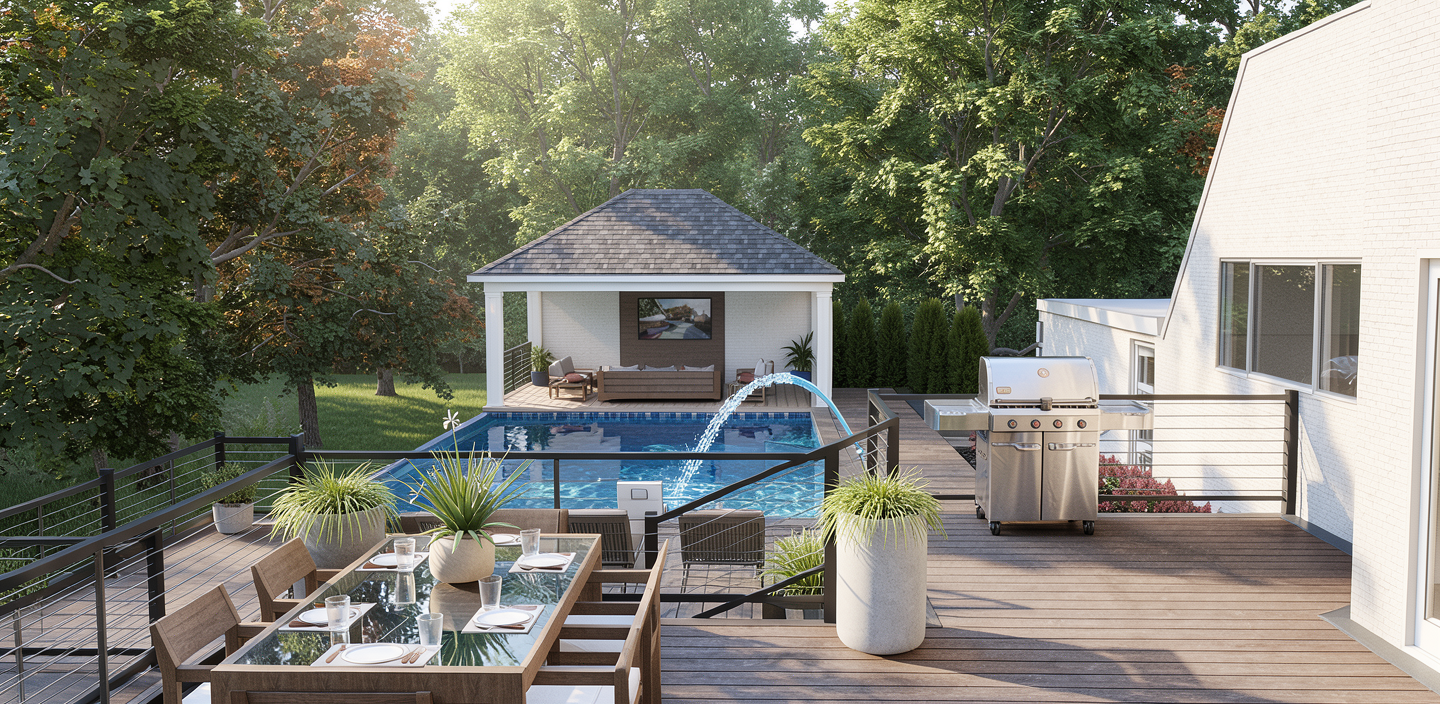 keep the view through the windows true to the image a modern and tranquil study room with a soft blue gray ceiling and warm wooden walls the tables have a textured speckled brown surface while the chairs are upholstered in a muted sage green fabric soft yellow pendant lights hang from the ceiling casting a warm glow a row of books in vibrant colors adorns the built in shelves lush green plants line the divider between the workspaces adding a touch of nature the atmosphere is serene and focused perfect for study or work