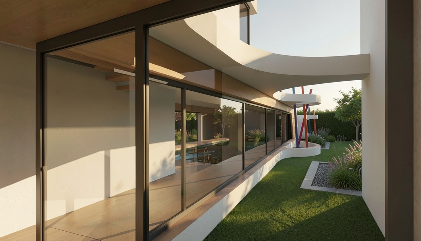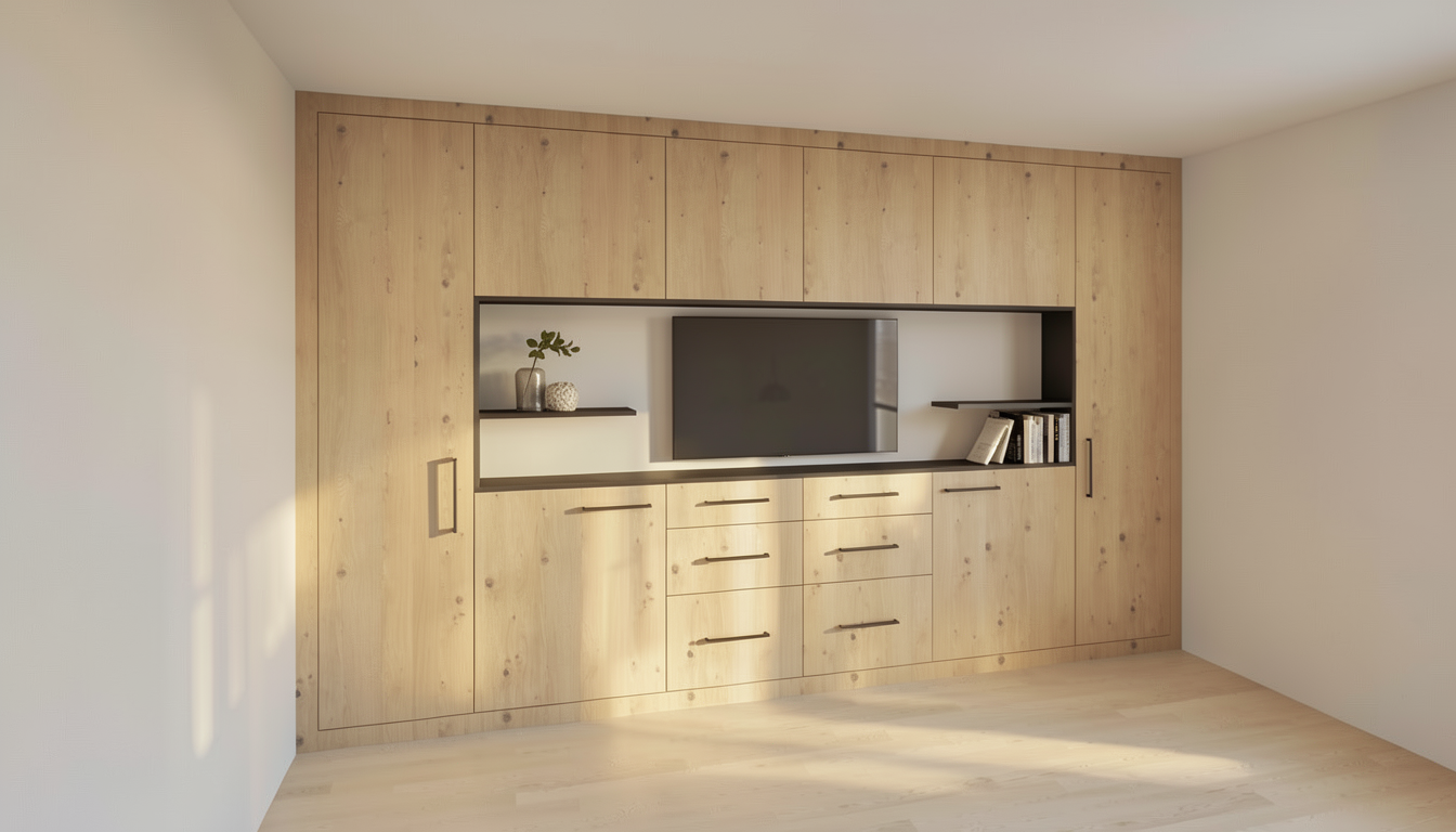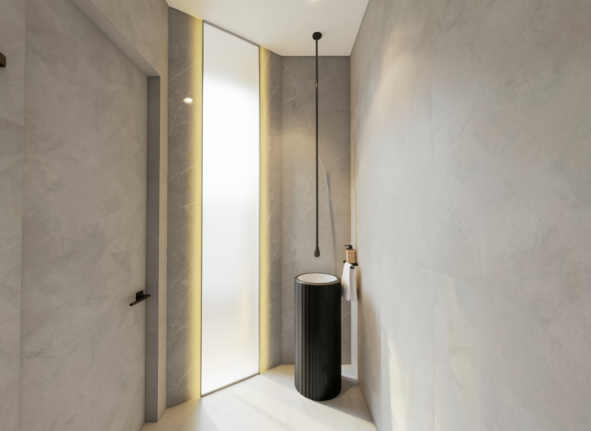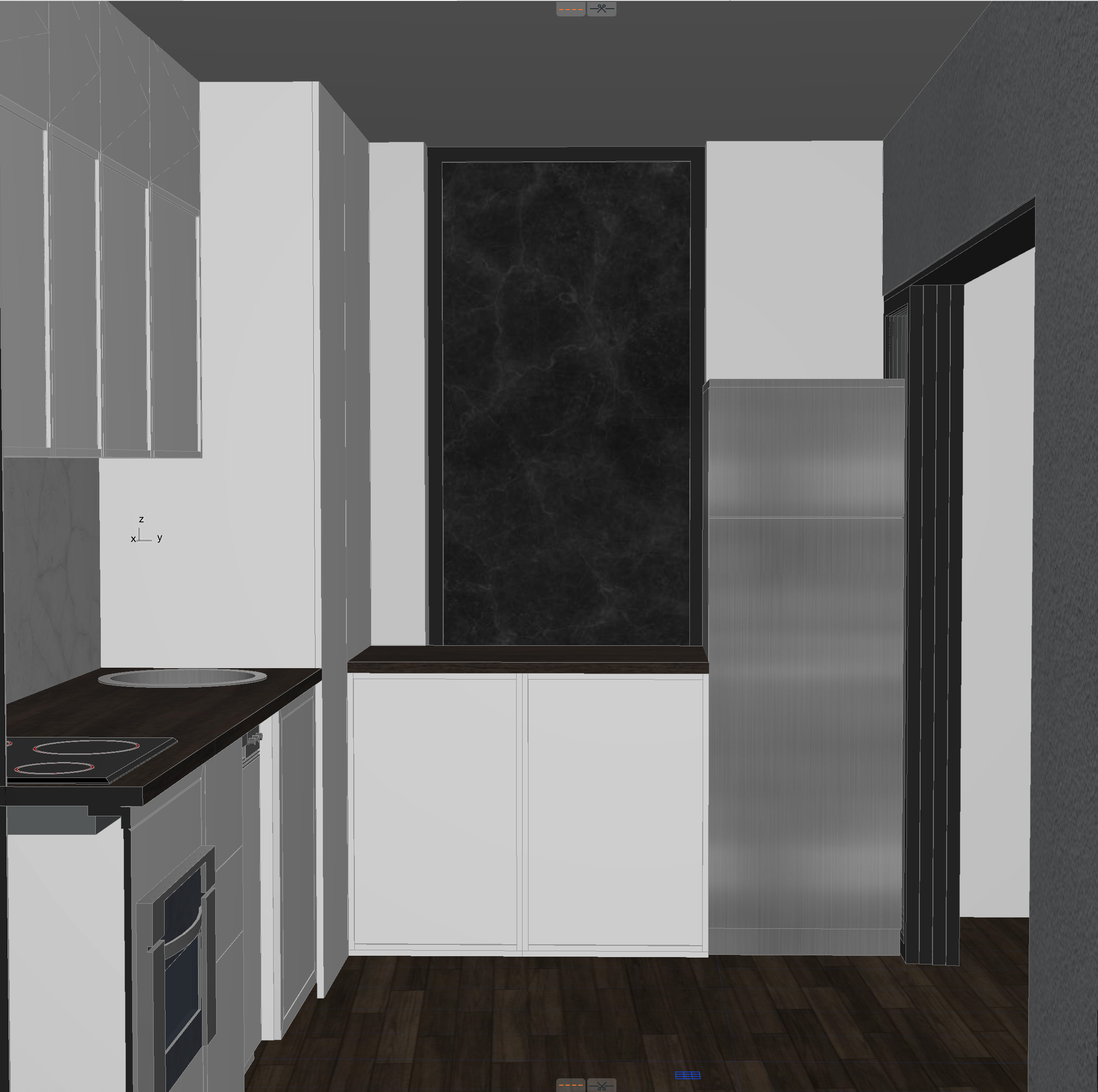 modern narrow kitchen interior realistic proportions frontal perspective at the back wall a large vertical illuminated onyx panel acting as a glowing feature element with deep black tones and subtle natural veining softly backlit kitchen furniture with mdf doors in light wood finish light oak or maple tone matte flat panel handleless design for a clean minimalist look countertop made of polished black marble with fine white veining creating strong contrast with the light cabinetry left side linear kitchen with built in oven and cooktop integrated sink continuous countertop and upper cabinets aligned vertically and horizontally back wall lower cabinets under the onyx panel with matching light wood mdf fronts right side tall unit with stainless steel refrigerator floor finished with beige ceramic tiles subtle texture medium size warm tone to balance the dark countertop and onyx wall walls in smooth light neutral finish off white or very light grey lighting warm ambient lighting combined with led backlighting behind the onyx slab and under cabinet lighting to emphasize materials and depth style modern minimalist warm contemporary balanced contrast between light wood dark stone and soft neutral surfaces