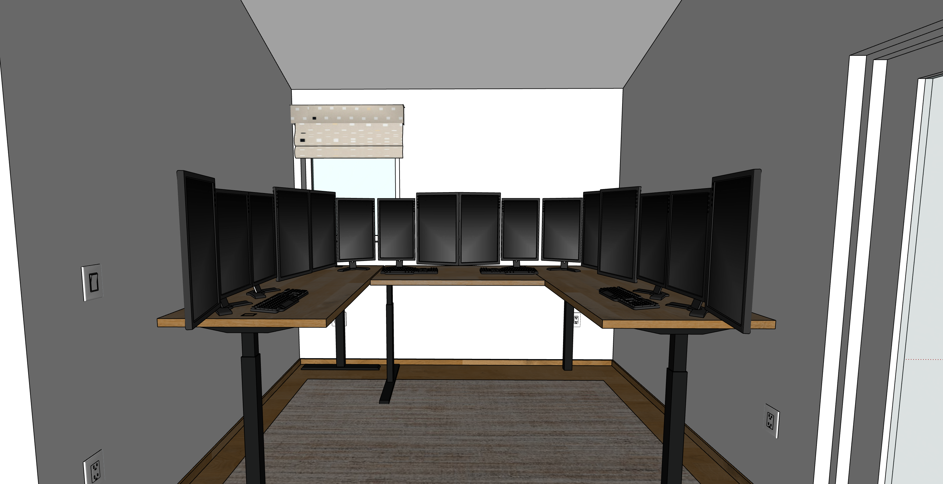 render in a realistic way with natural light raking in from the left window and french door on right the standing desk tops are natural white oak the walls are white the rug was more accurate in the last render
