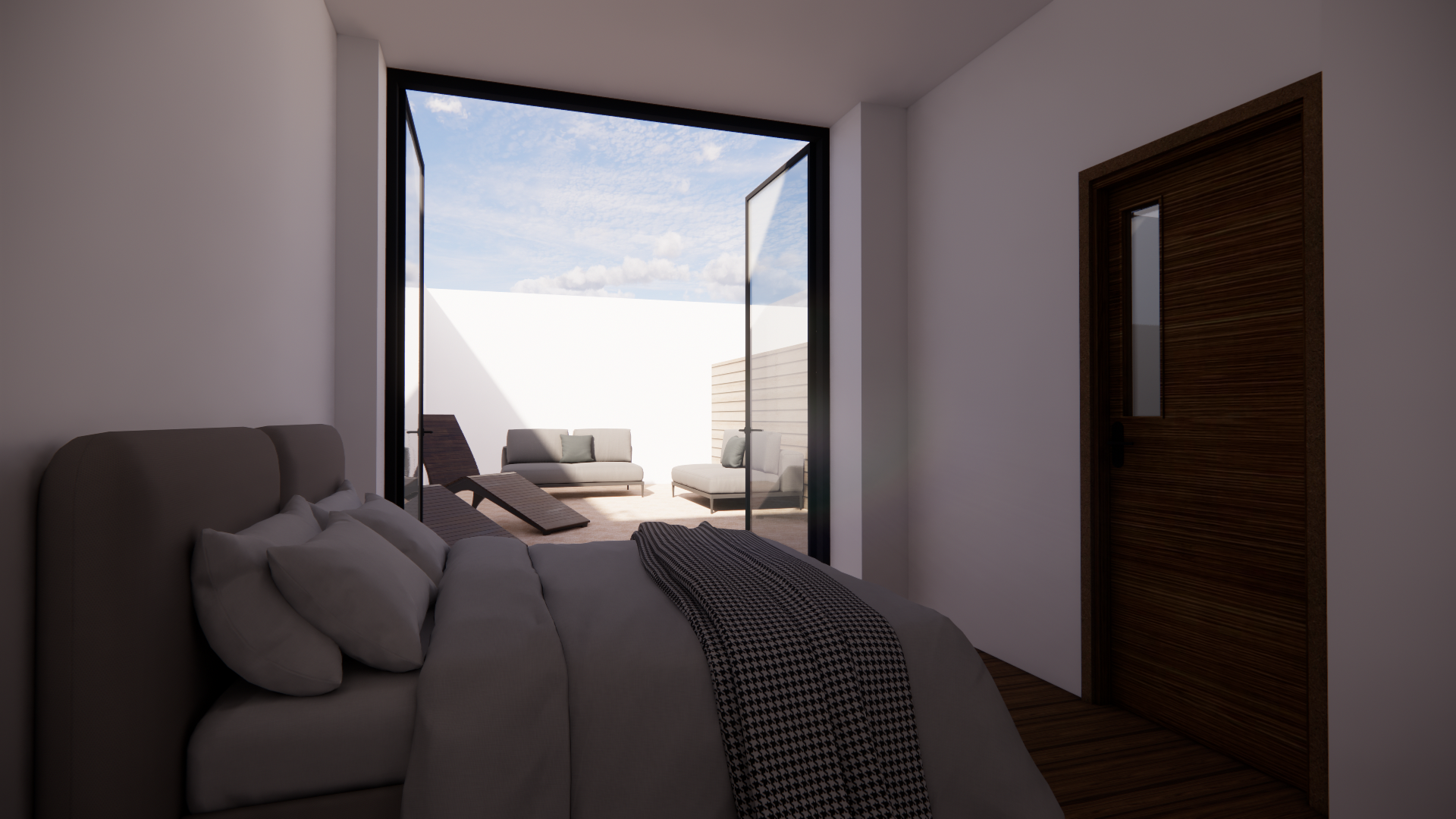 modern bedroom with doors opening up to yard with seating area and a lot of greenery the flat is in athens greece modern artwork above bed hidden led lights on the ceiling