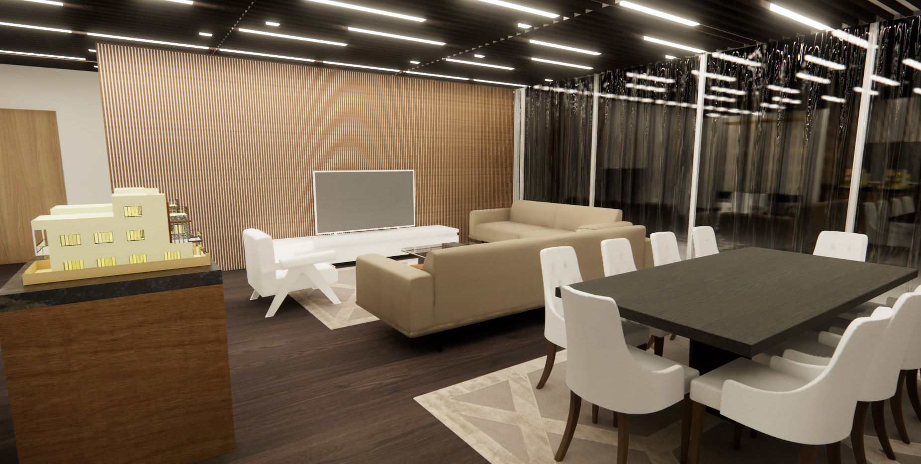 avoid direct sunlight make the environment more realistic close the all curtains tv open screen overall brighten sofa gray color armchair orange color tv cabinet black color