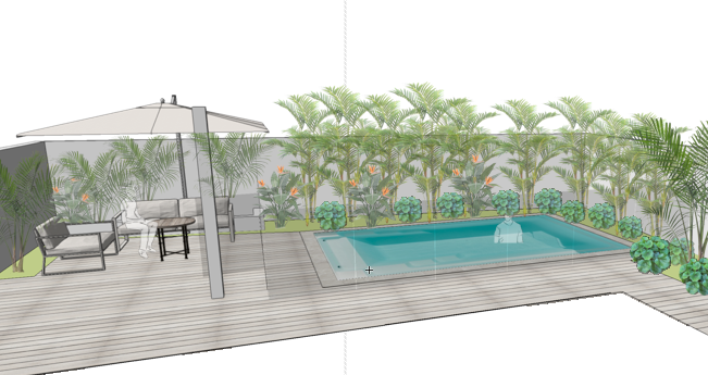 add tropical planting to green shaded areas only keep glass pool fence remove post
