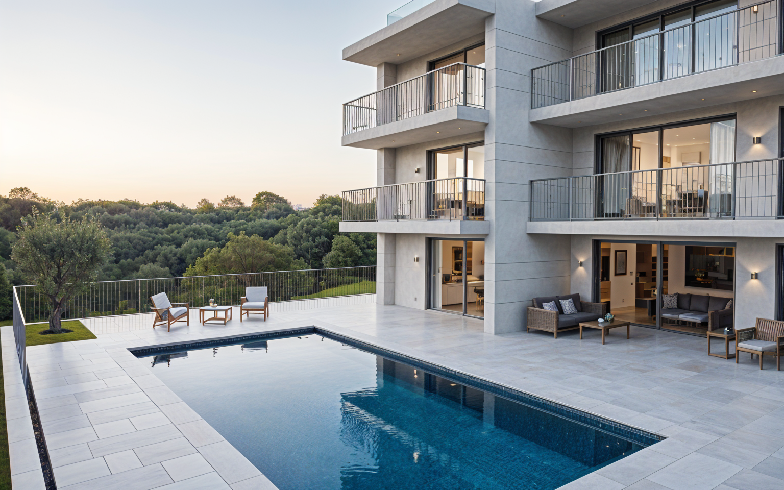 bauhaus night shot medireranean forest background olive trees in garden glamour interiors in windows grey vertical stripes full floor height random railings ethimo furniture grey window frames white 10cm striped facade white marble pavement shining blue mosaic pool in front of balconies random floor to floor vertical striped panels 80 by 320 cm architecture