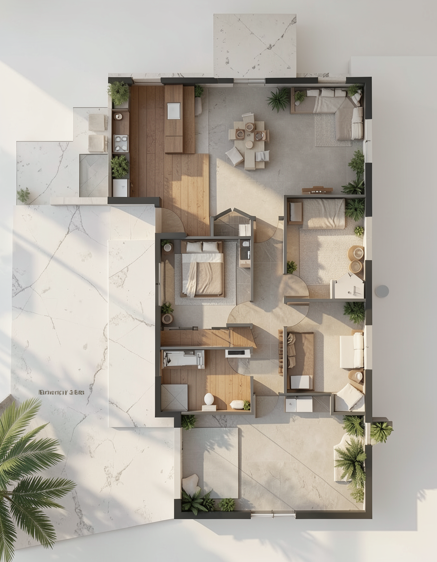 exterior shot please do not change the structure of the house and use the moodboard only to render the house in similar materials and colors