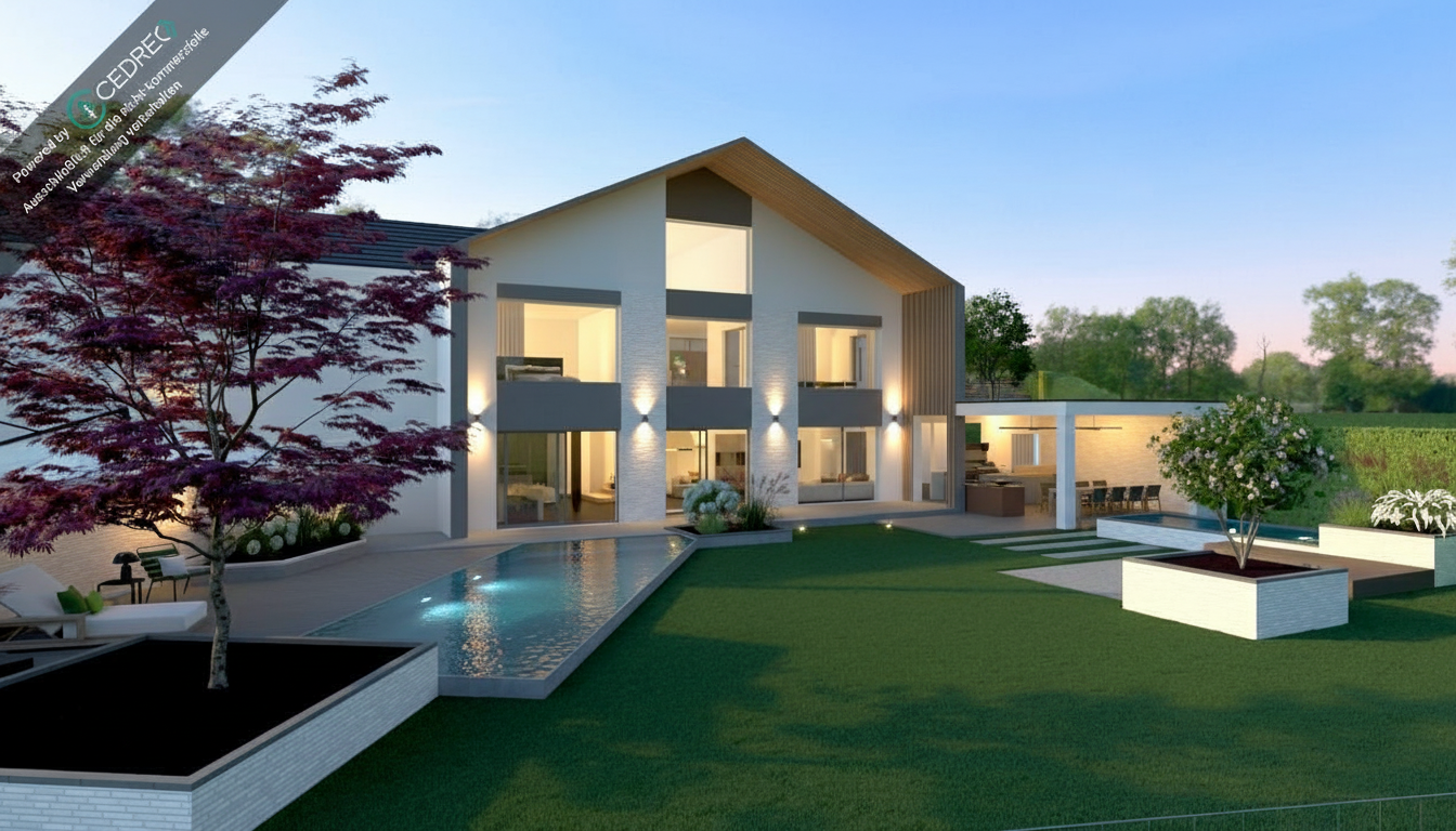 exterior shot keep building shape exactly like my drawing dark grey windows and fascias white render around the patio doors brick on first floor in the background and brick around ground floor window ocean blue cladding around first floor gable window and gable in the background