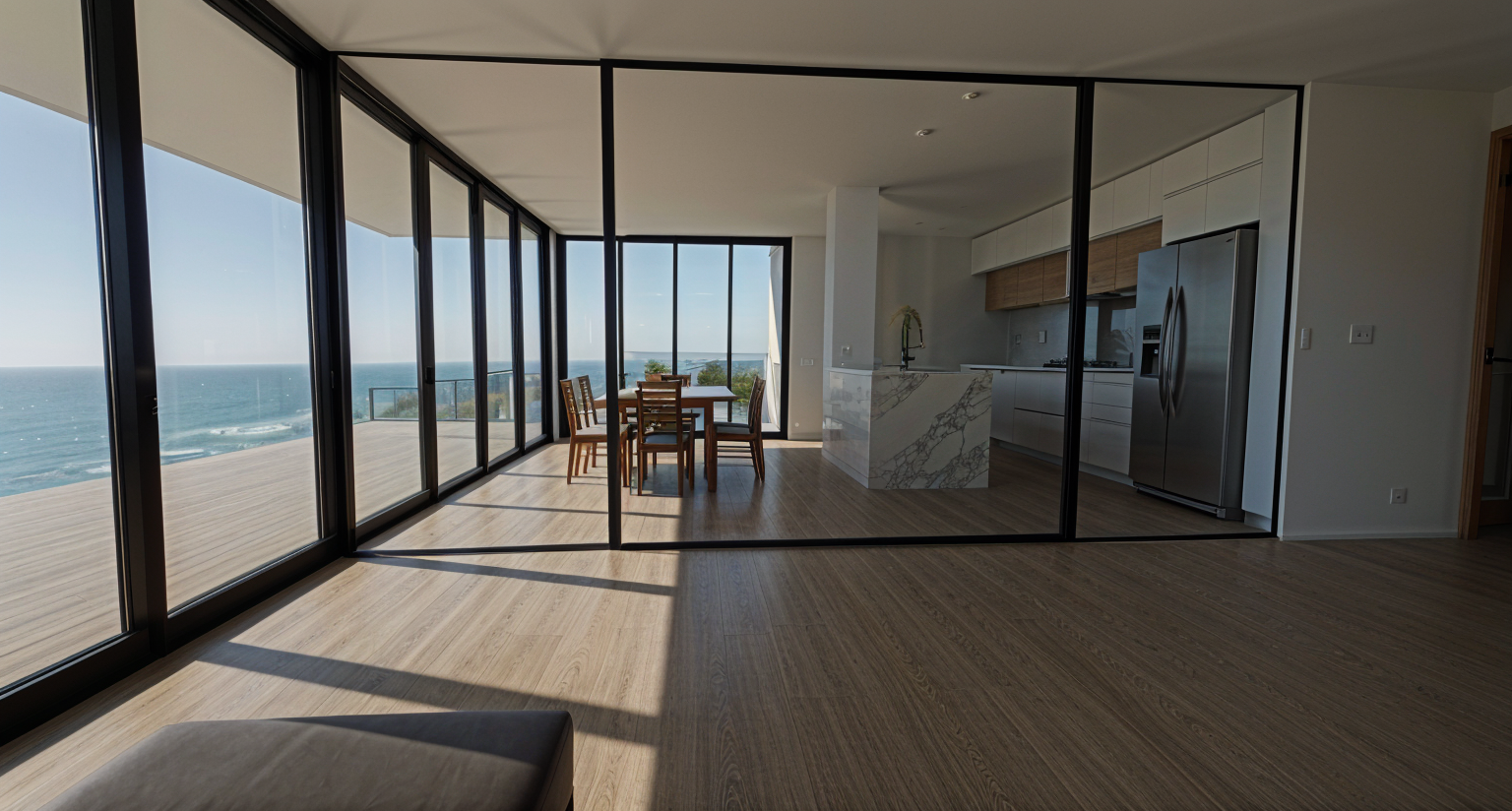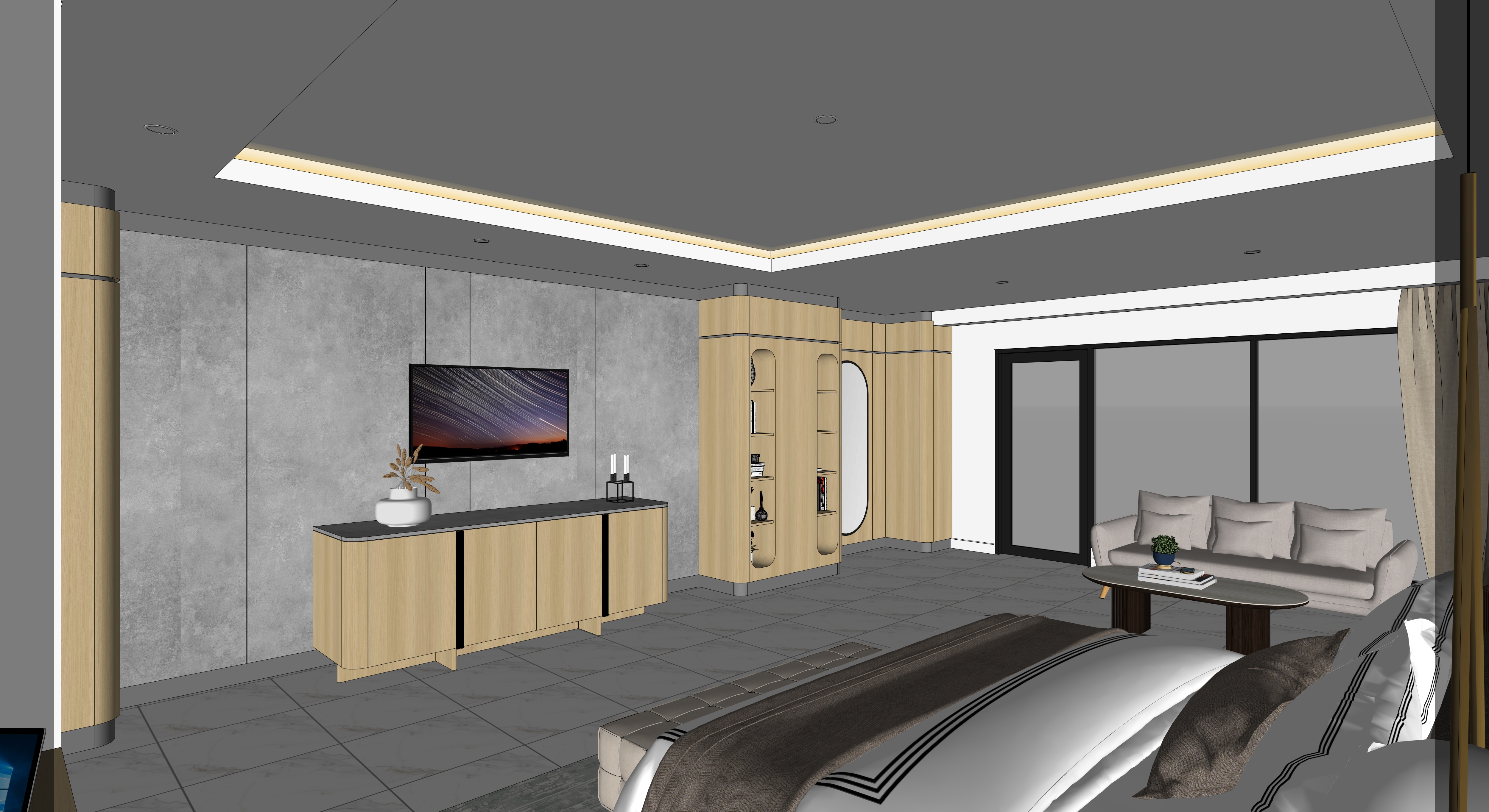 render a modern elegant bedroom interior use soft beige and natural wood tones for the furniture and shelving the bed should have white and dark gray linens with brown accents the walls should feature a soft white paint matching the floor use a white for the ceiling and led strip lights for ambient lighting include a sleek flat screen tv on one wall with minimalist art nearby decorate with small potted plants in rich green for a touch of nature and metallic decor elements for sophistication the atmosphere should be cozy warm and inviting