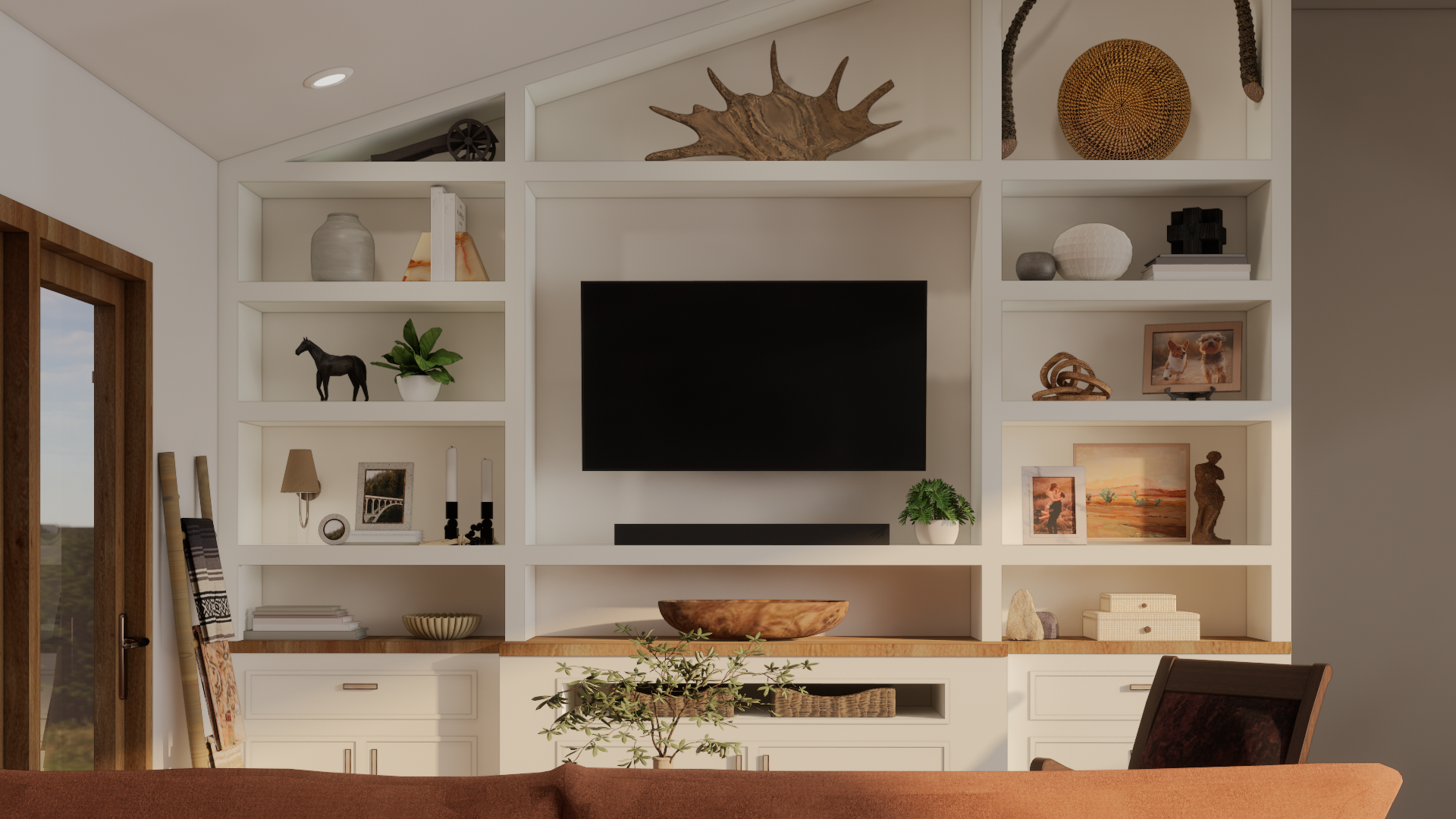 preserve same built in shelving proportions same niche sizes and spacing same tv size and placement same cabinet alignment and drawer proportions same countertop thickness same shelf depth same decor placement same camera angle and perspective do not resize redesign move or alter any millwork cabinet geometry shelf spacing or tv dimensions enhance realism only add concealed led lighting soft integrated integrate subtle concealed led strip lighting into each and every built in niches the lighting must be fully hidden within the upper interior edge of each niche not show visible light strips or hardware emit a soft warm white glow 2700k 3000k create gentle wash lighting down the back of each niche highlight decor softly without harsh hotspots add subtle shadow depth beneath objects feel architectural and built in not decorative do not change shelf thickness or niche proportions the lighting should feel integrated into the millwork design millwork finish refinement enhance cabinetry so it reads high end soft warm white painted finish with subtle satin sheen clean trim lines gentle shadow depth inside niches refined wood countertop with natural grain variation subtle edge highlights preserve all proportions exactly shelf styling no rearranging maintain exact decor placement and spacing enhance realism only subtle ceramic texture refined wood grain soft glass reflection on frames gentle shadow beneath objects do not reposition or add decor tv area maintain exact tv size and alignment enhance realism subtly slight screen reflectivity no glow or active display no change in dimensions lighting direction overall balance the new led glow with mid afternoon light flowing into room warm residential tone no harsh contrast no dramatic spotlighting the led should feel subtle and premium not theatrical final instruction increase material richness depth and architectural polish while preserving the entire built in structure exactly as modeled no geometry changes no decor rearrangement no proportion adjustments enhance realism only