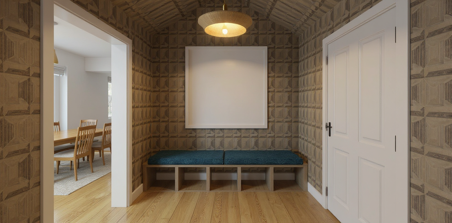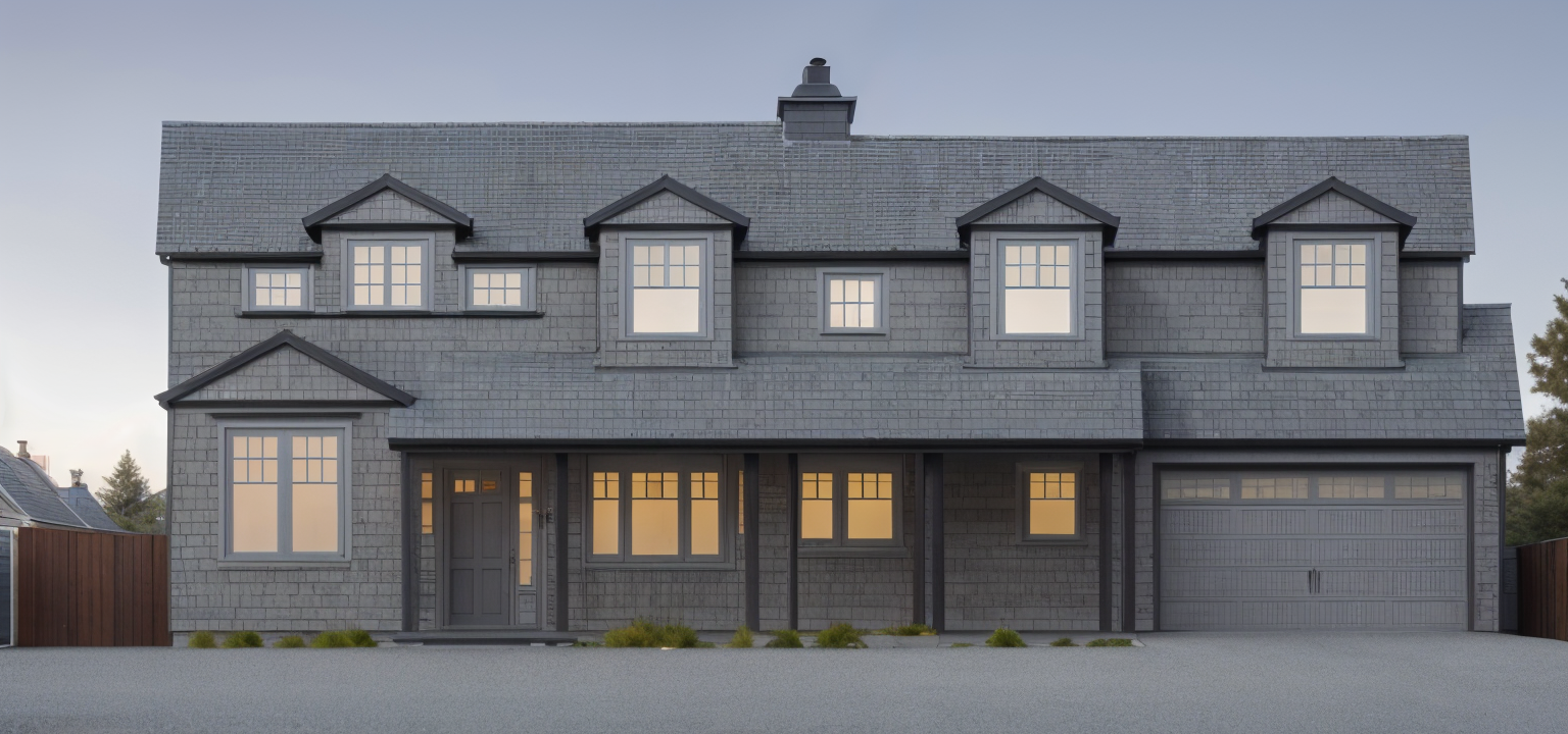 grey shingle house with white trim with asphalt roof and double columns front stairs are stone architecture