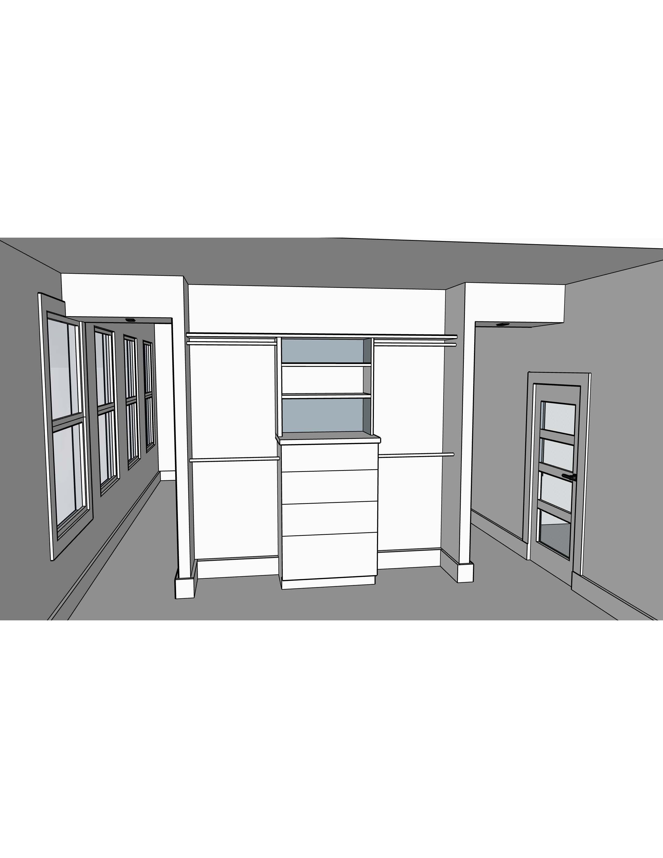 closet wall with built in cabinet in center entrances on both sides rustic wood floor white ceiling and walls black windows architecture