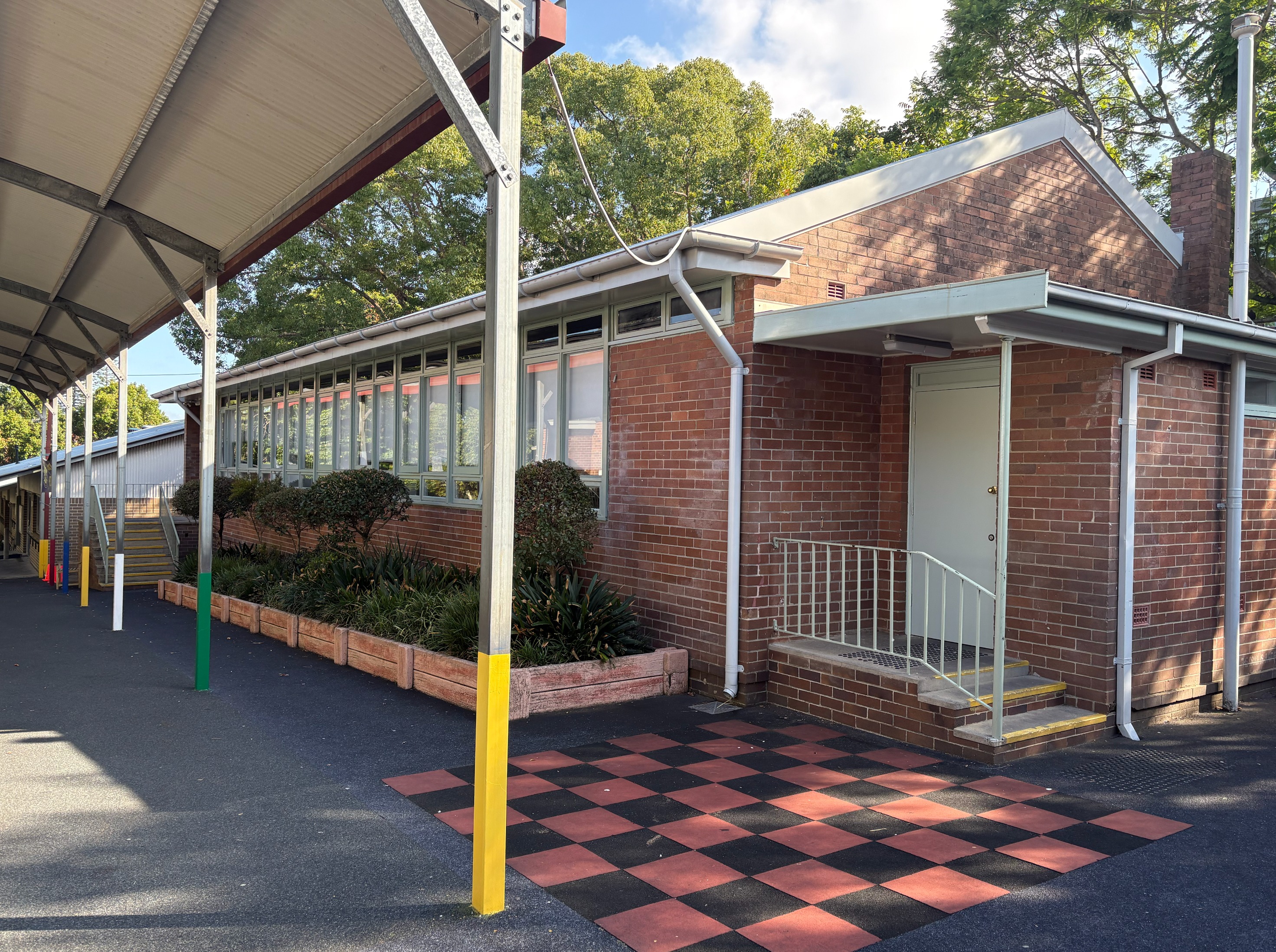red brick building replace all windows along the wall with bifold doors remove garden beds at ground level and replace with full length timber deck