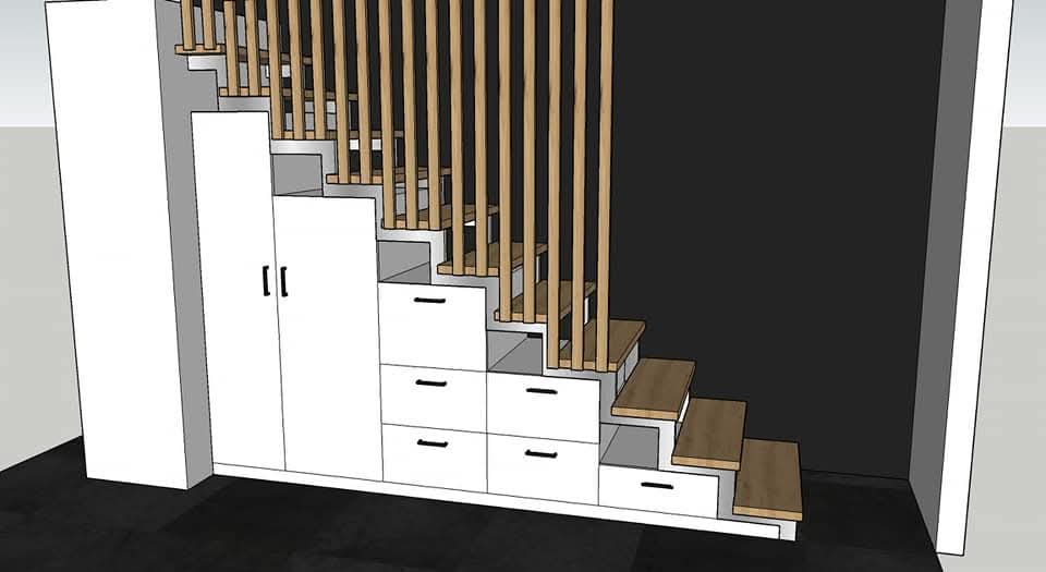 certainly here s a prompt for your ai image generator render a beautifully designed modern staircase with integrated storage feature sleek white cabinets and drawers accented with minimalist black handles the stairs are a rich warm wood tone contrasting elegantly against a dark charcoal wall use soft ambient lighting to create a cozy and contemporary atmosphere the flooring is a deep matte black enhancing the overall sophisticated look of the space