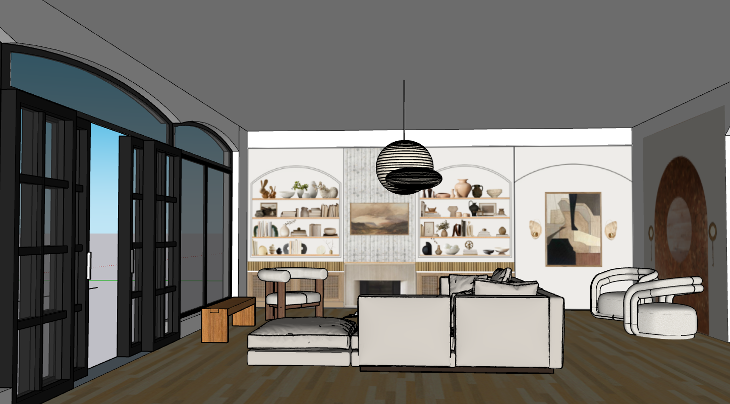 can you add realistic rendering to this image make it light wood oak flooring and light wall paint add some lush greenery view from window do not alter any furniture position architecture