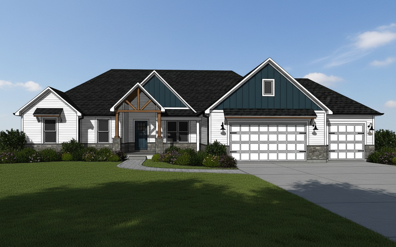 modern exterior shot photorealistic rendering of a luxurious one story modern mansion featuring a sleek flat roofline expansive glass entryway black marble columns dark gray smooth stucoo warm wood panels dark metal finishes at the roof fascia and large windows glowing with interior light a wide stone paved driveway is illuminated with subtle ground and fa ade lighting creating a dramatic modern ambiance tropical landscaping with palm trees frames the scene two exotic sports cars a bright red ferrari and a yellow porsche are parked in front reflecting the lights for added realism cinematic wide angle perspective ultra hd moody sunset sky with soft ambient glow architecture
