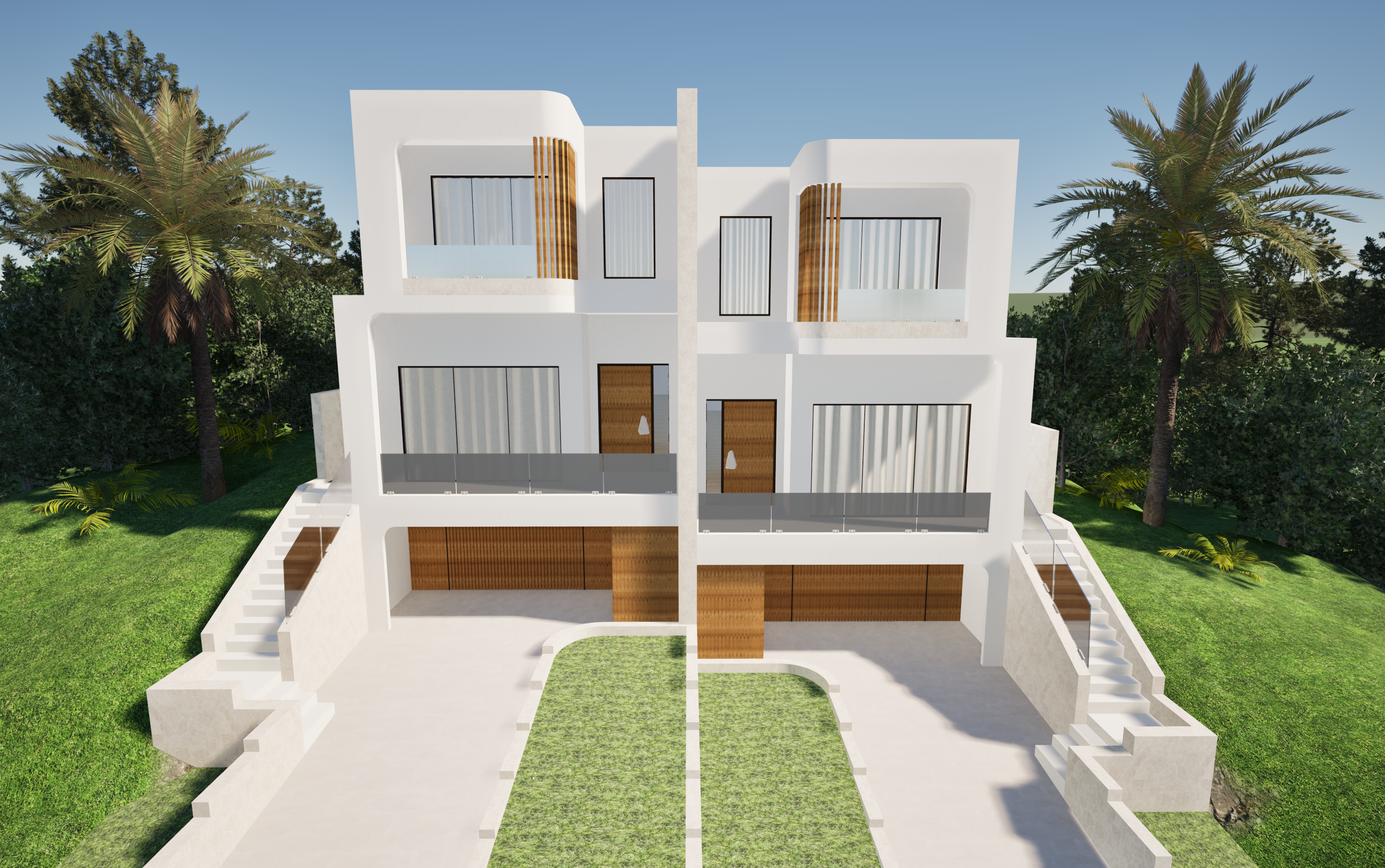 photorealistic exterior render keep all existing geometry exactly as modelled the area beneath the balcony driveway is a full opening on both sides not a wall not infilled not grey not altered all walls keep their original materials and colours no single wall changed grass only where already modelled kept neat and trimmed no grass added to driveways openings or hardscape do not add remove or modify any architectural elements