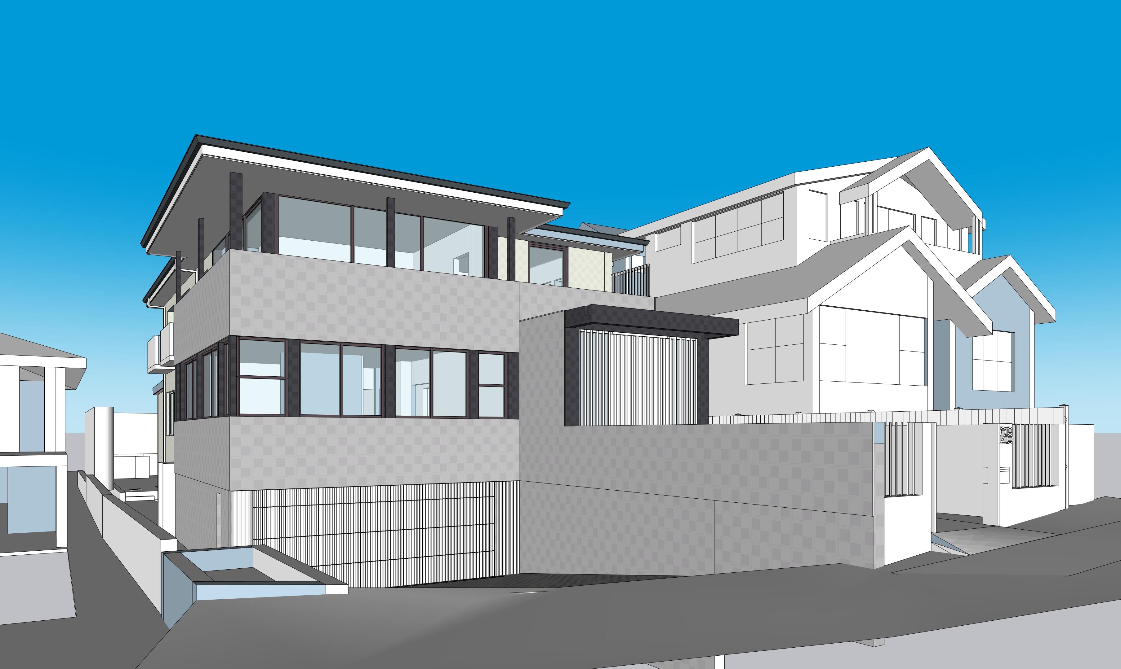 exterior shot render a beautiful australian modern house with a minimalist design the exterior walls of the house are a clean light gray color with subtle stone textures the roof is sleek and dark gray the garage door is crafted from natural wood providing a warm and earthy contrast large windows with black metal frames allow ample natural light to enter the front door is a modern design with a black metal frame and frosted glass along the sides there are wooden fences in a light natural wood color for privacy and aesthetic charm the driveway is paved with cobblestone the front yard features a lush green lawn the atmosphere is calm and serene with a clear blue sky and soft sunlight casting gentle shadows giving the scene a peaceful welcoming feel architecture australian climate and enviroment architecture