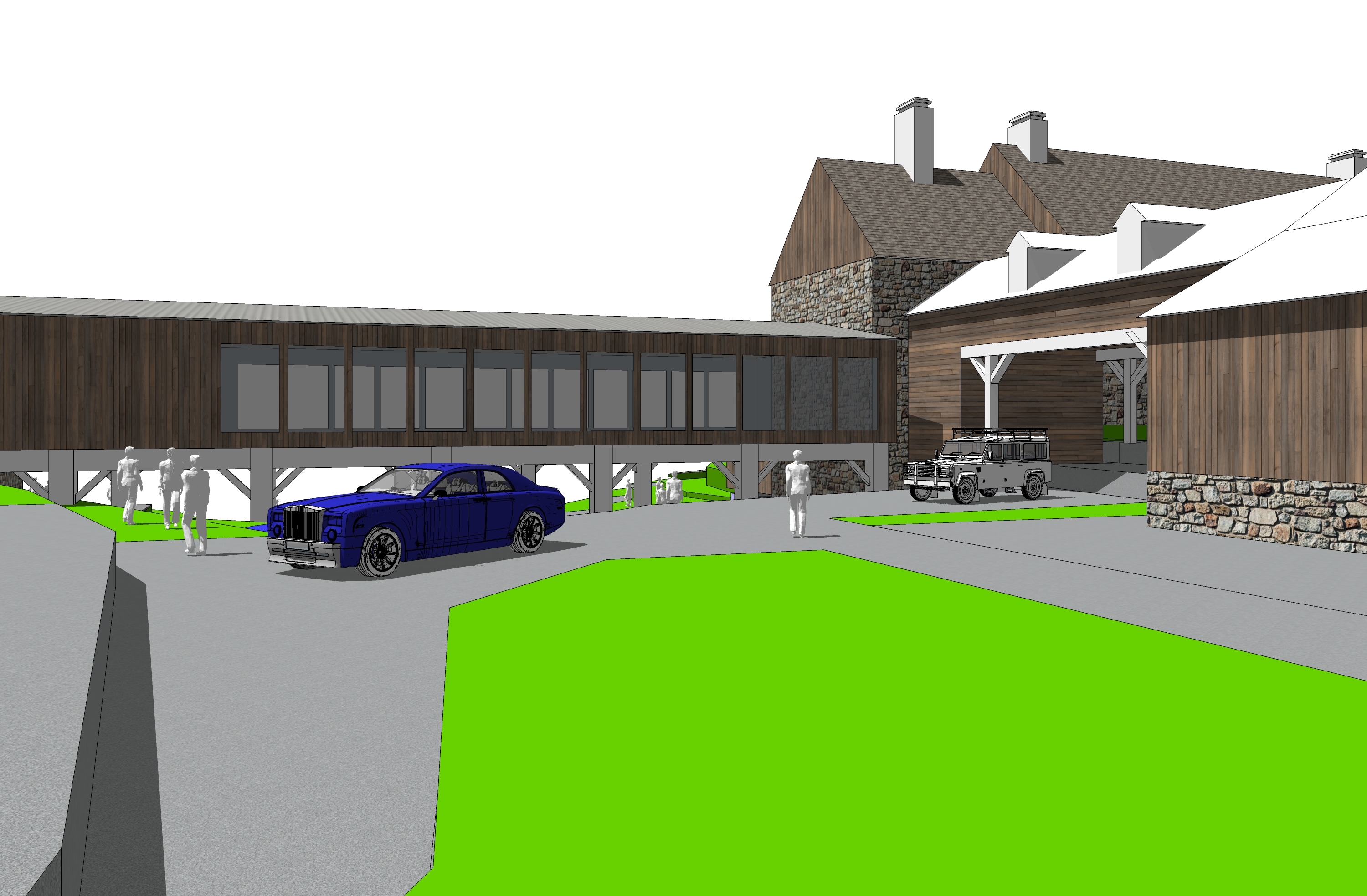 carriage house with vertical shiplap covered bridge with large grid windows old stone farmhouse tall grass and driveway in foreground trees in background fog