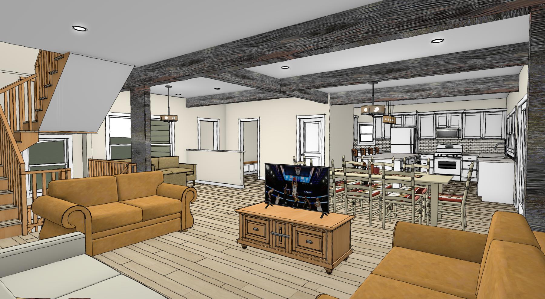 rendered interior of a cozy rustic living room with warm autumn colors the walls are cream and the sofas are a rich caramel brown adding warmth and comfort the wooden beams and staircase have a weathered gray brown finish enhancing the rustic vibe the floor is light oak complementing the overall earthy palette the kitchen cabinetry is white with a backsplash of soft gray tiles creating a sleek contrast the atmosphere is inviting and cozy with gentle soft lighting creating a warm ambiance add lighting under the wall cabinets add kitchen appliances to the countertops