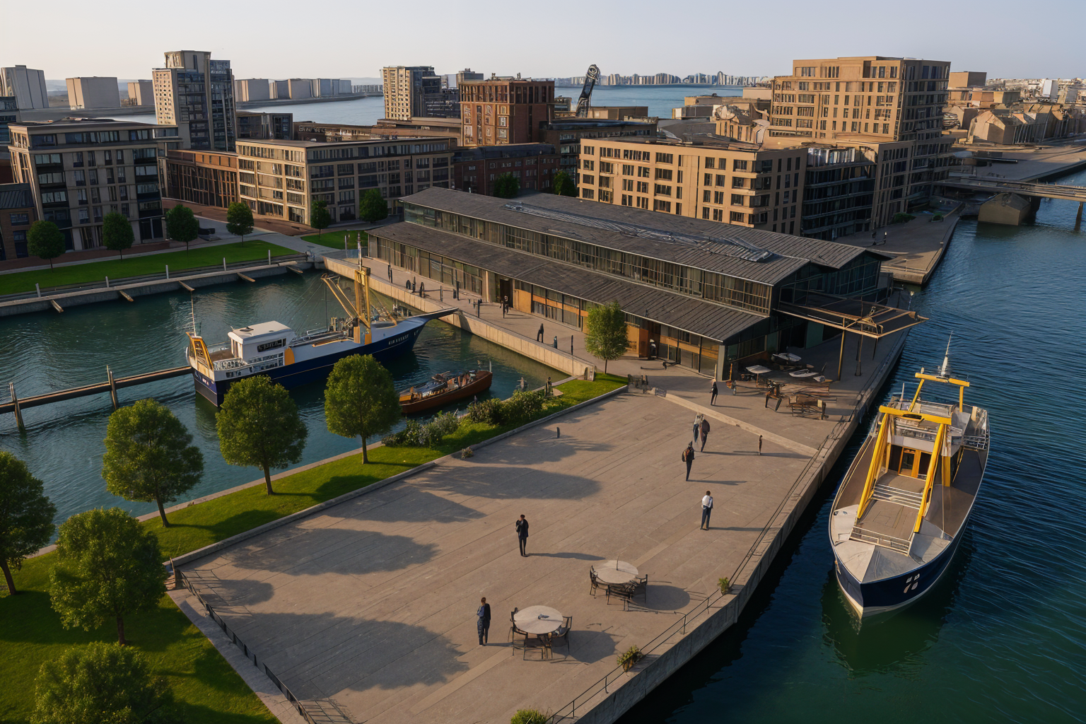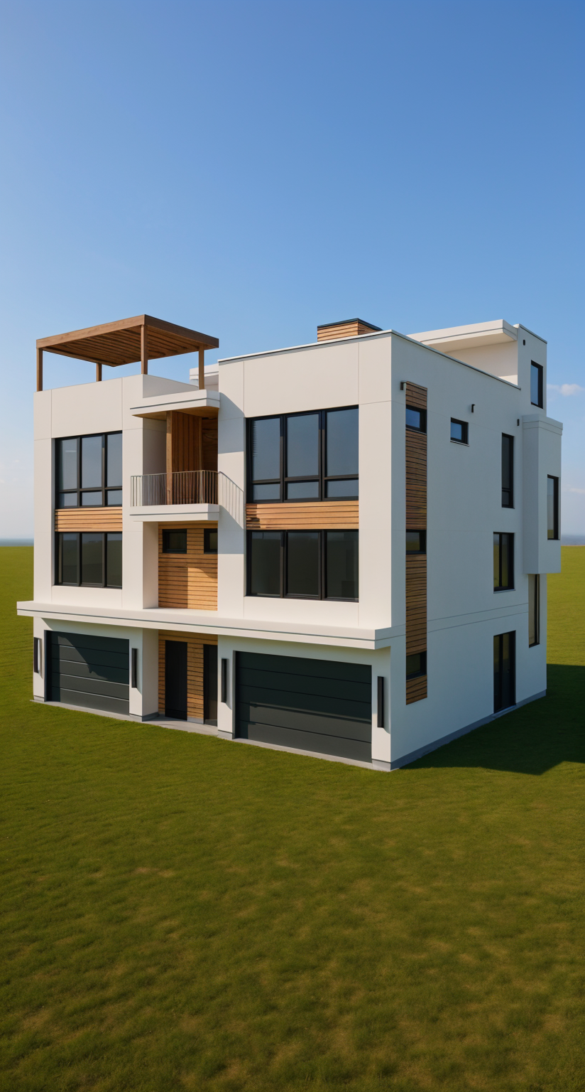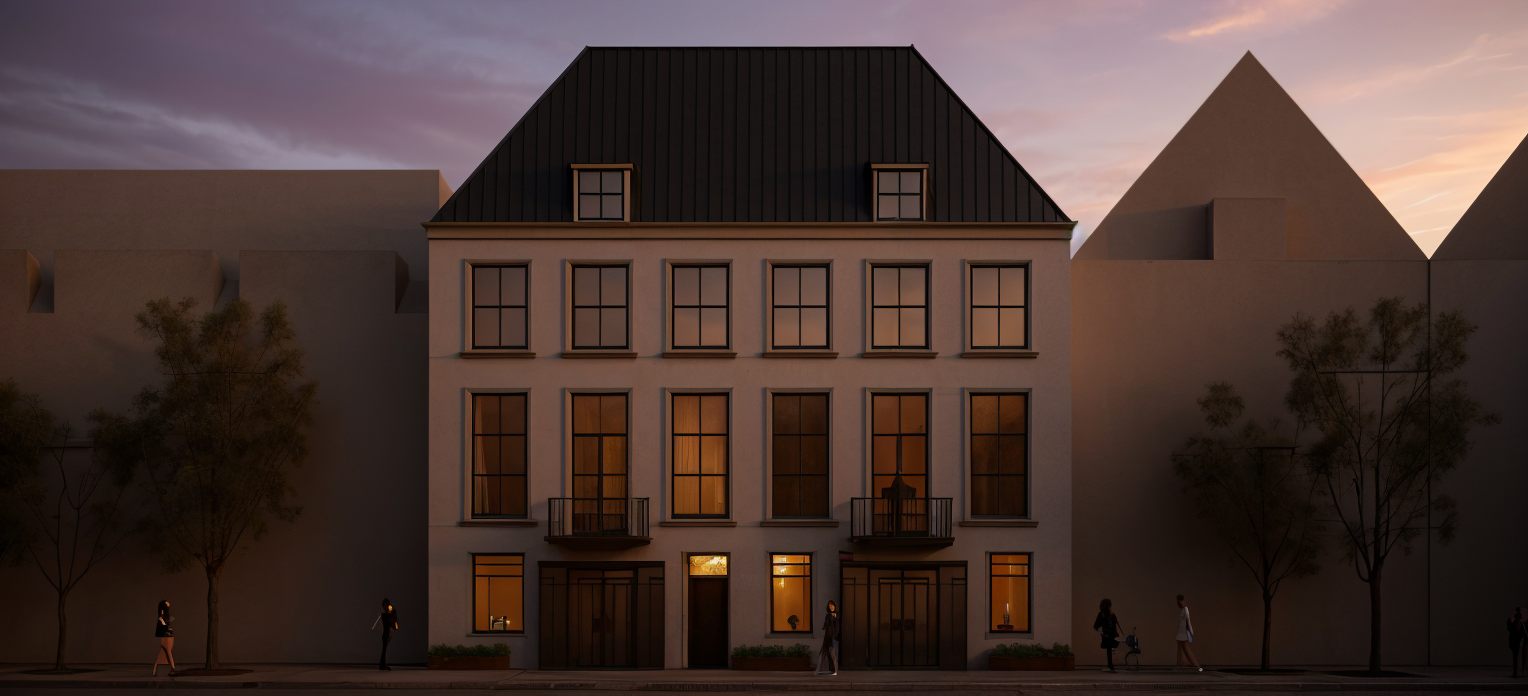 add some people in front of the building time of the day is just before sunset roof is with dutch ovh rooftiles keep plaster as facade facade is white plaster with horizontal lines