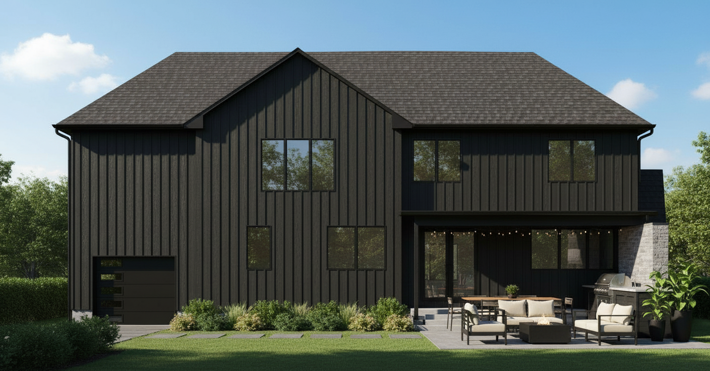 old mill house vertical wood shiplap covered bridge with large grid windows driveway with jeep foreground tall grass throughout fog trees in background