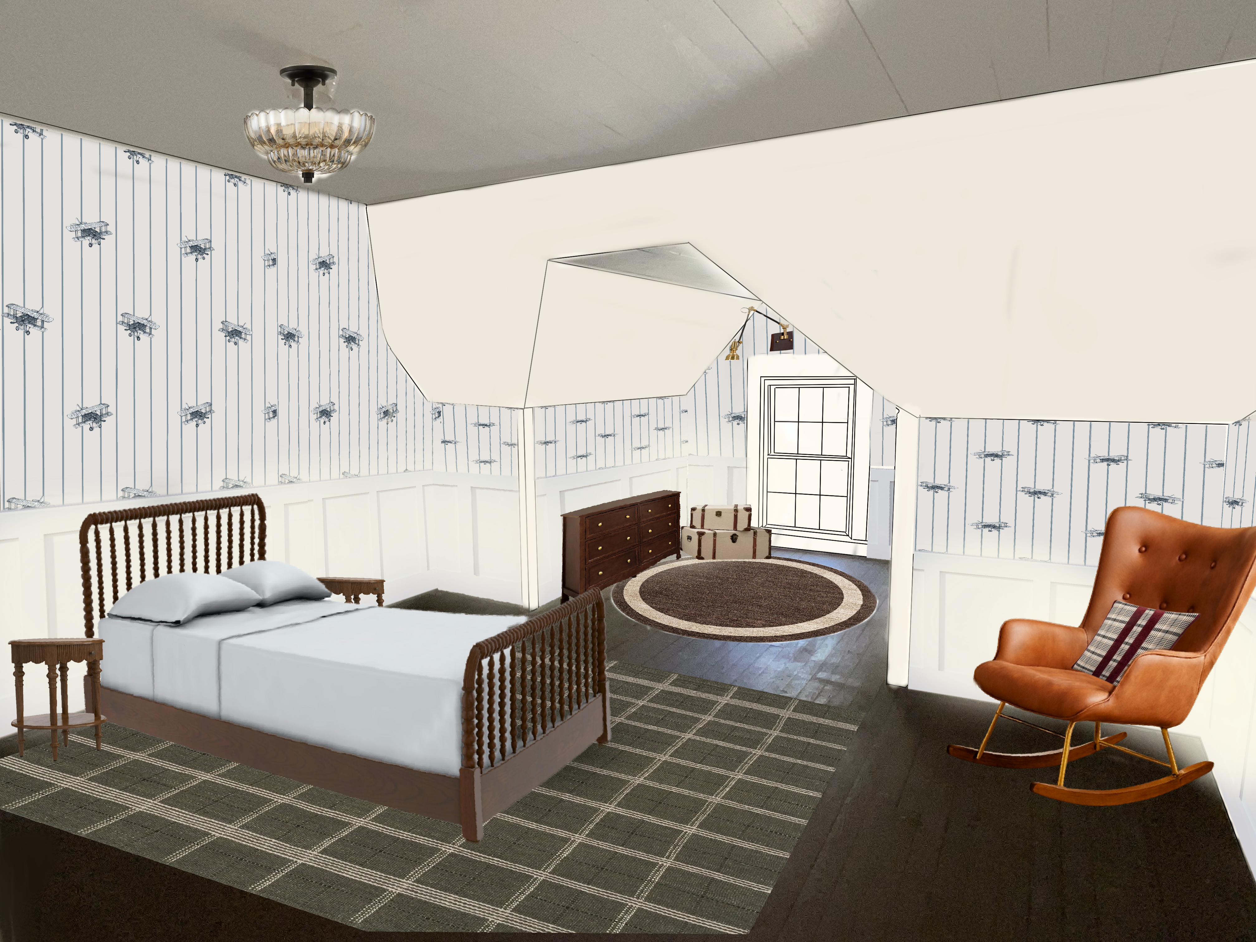 interior shot keep furniture the same style as well as light fixtures note that the design on the pin stripe wall paper is planes they is a wall mounted light in the dormer nook above the window it needs to stay a wall mounted light the floors and ceiling will stay original the chests next to the dresser are antique chests style it to feel as a magazine worthy heritage style young boys room
