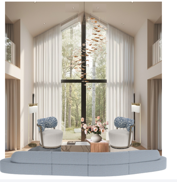 photorealistic modern double height living room with full height window wall and sheer curtains soft natural daylight filling the space warm neutral palette beige warm white light wood muted blue accents symmetrical layout focus on chandelier realism large sculptural glass chandelier with many small organic glass pieces petal like physically supported with thin suspension wires and ceiling canopy not floating natural gravity based arrangement enhanced glass material with high transparency reflections refraction slight imperfections realistic thickness lighting strong soft daylight from window sunlight hitting chandelier creating subtle sparkles and reflections chandelier lights on with warm glow 2700k soft and not overpowering natural shadows and light diffusion through curtains furniture curved light blue sofa foreground two rounded armchairs with textured fabric and blue patterned cushions minimal coffee table with realistic flower arrangement soft pink peach roses naturally lit material realism visible fabric texture soft curtain fibers natural wood grain subtle gloss on decor slight imperfections to avoid cgi look extra realism real outdoor greenery view slightly blurred soft reflections on floor and glass balanced exposure no overbrightness camera eye level centered symmetrical slight wide angle focus on chandelier and center