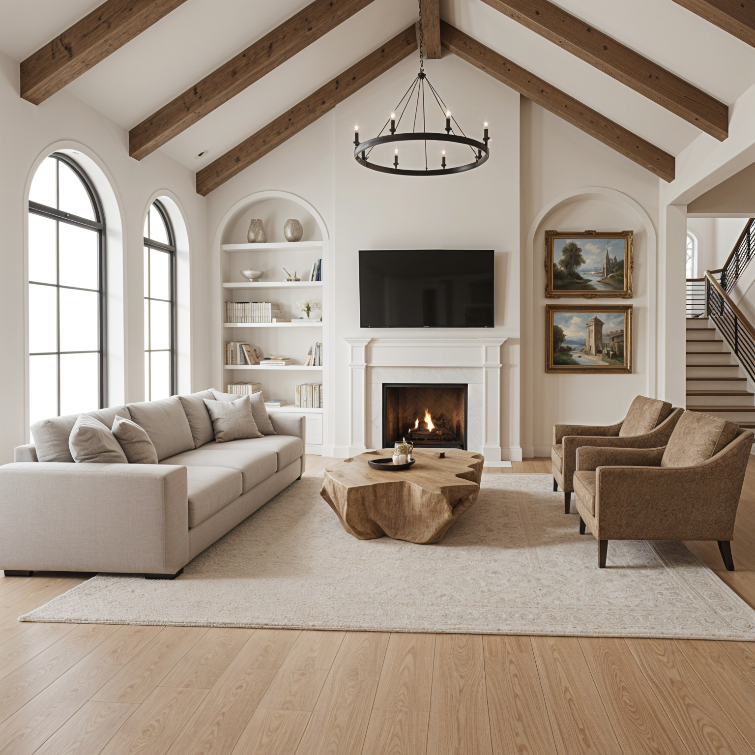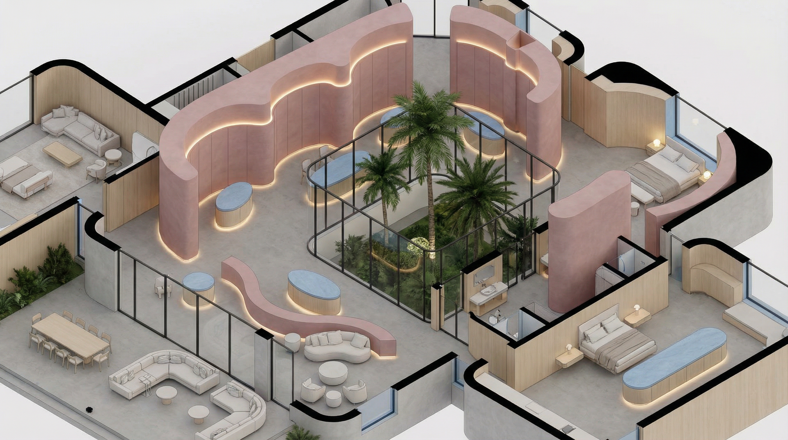 convert this floor plan into a modern isometric 3d view of a full house show the space from an elevated angle with furniture walls and details visible use the attached floor plan image as a strict spatial reference generate a 3d interior rendering emphasizing the relationship between interior closets and the open air courtyard courtyard fully open to sky dense palm planting acts as the primary source of daylight architecture large glazed openings between interior and courtyard light penetrating deep into the space reflections on millwork and floors lighting quality soft tropical daylight dappled shadows from palms goal express openness calm and continuity between nature and architecture use the same furniture as shows on the plan do not change the orientation of the floorplan