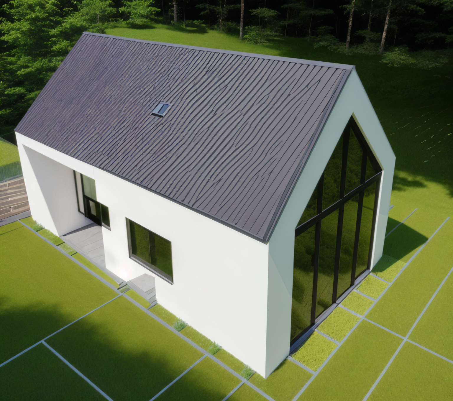 cottage with facade made of corrugated sheet metal on meadow in valley with hills in background architecture