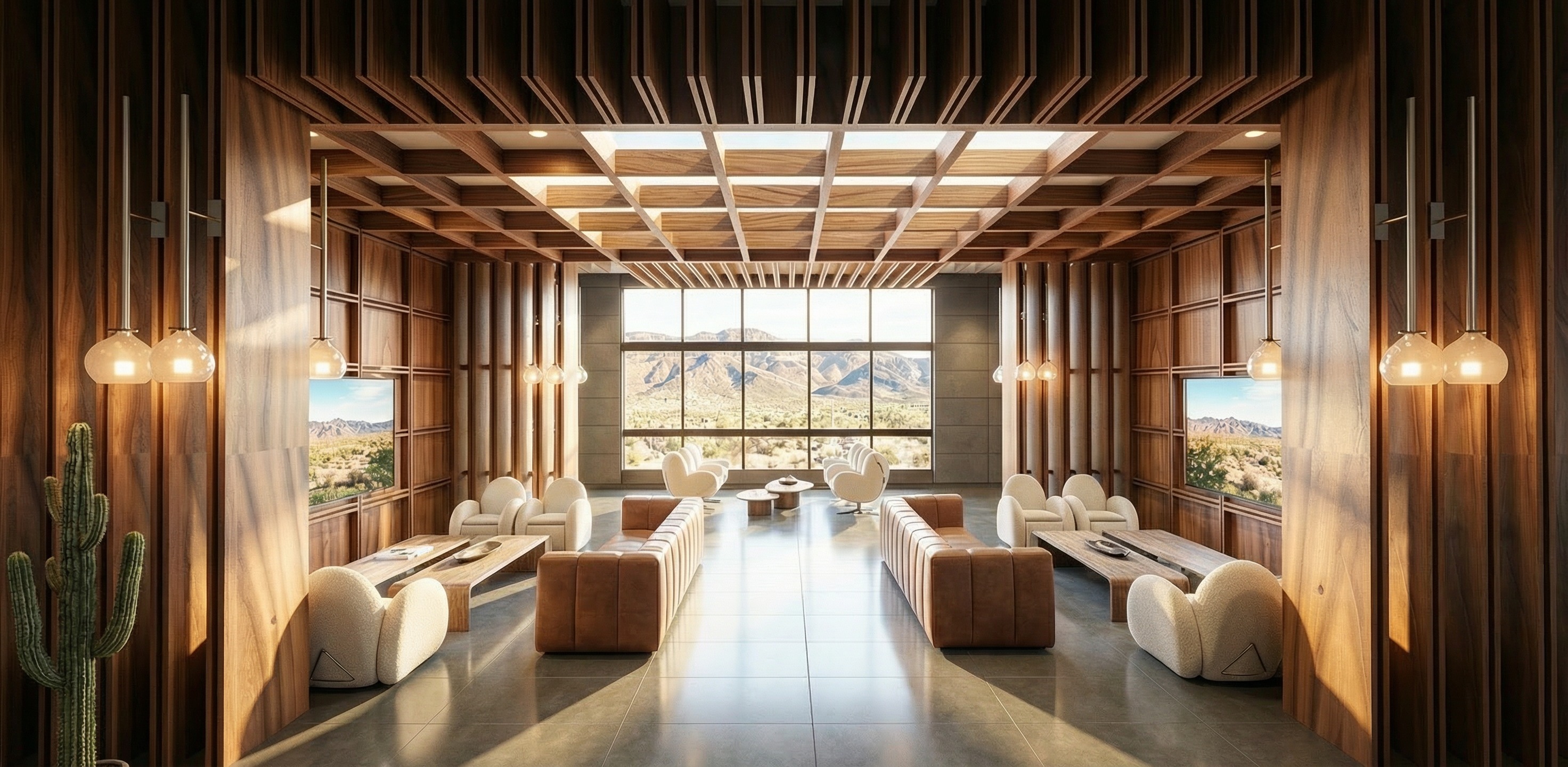 the ceiling wood grid in the center lobby should be deeper