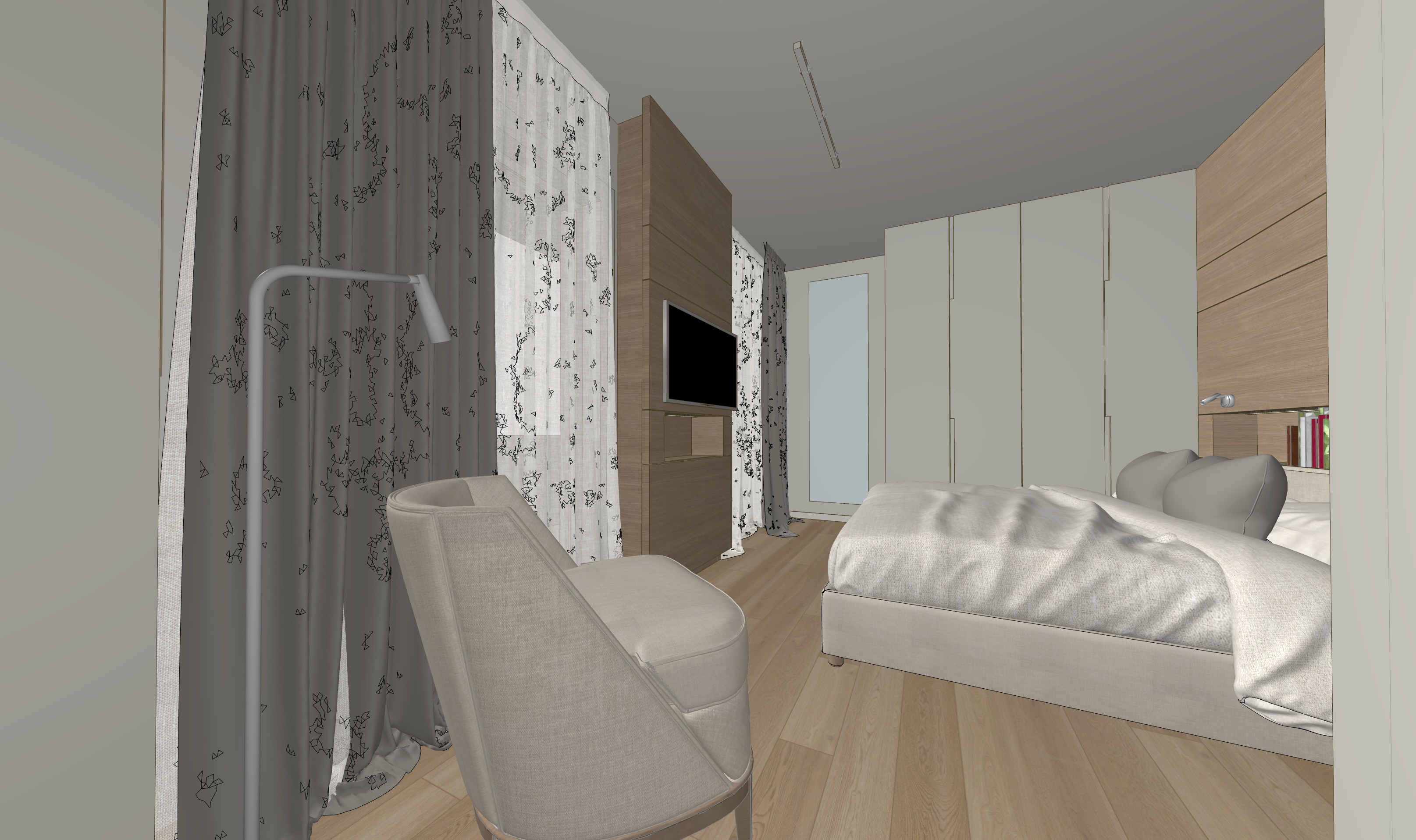pavimento in parquet rovere chiaro arredi in rovere chiaro e tessuti bianco e beige specchio in fondo di fianco ad armadio strip led solo nella nicchia tv e nicchia sopra testata letto a sinistra sommier in tessuto no strip led in alto