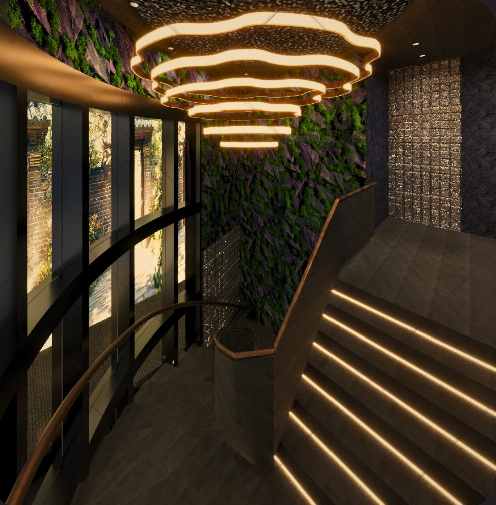mediterranean revival interior shot transform this stairwell render so it matches the architectural language and atmosphere of the biom health club foyer while preserving the existing architecture and layout convert the image into hyperrealistic architectural photography with physically accurate materials and lighting the stairwell should feel like part of the same monumental biophilic wellness sanctuary inspired by ancient temple architecture the floor should be finished with large format dark grey stone tiles similar to the flooring used in the entrance foyer the walls should be natural rock walls with rough textured stone creating a grounded cave like architectural atmosphere that contrasts with the smooth clay and stone elements seen in the foyer the ceiling should feature a large sculptural chandelier installation made from corrugated mirror panels reflecting warm architectural lighting and creating dynamic reflections across the stairwell integrate glass brick elements throughout the space used as architectural accents that softly diffuse light and create subtle glowing surfaces within the stairwell walls lighting should remain warm and atmospheric similar to the foyer soft indirect architectural lighting warm led glow along edges and transitions realistic light bounce across stone surfaces and subtle reflections from the mirrored chandelier maintain the calm sacred atmosphere of a wellness sanctuary cinematic architectural photography 24mm lens ultra realistic materials high dynamic range soft volumetric lighting natural imperfections physically accurate textures architecture