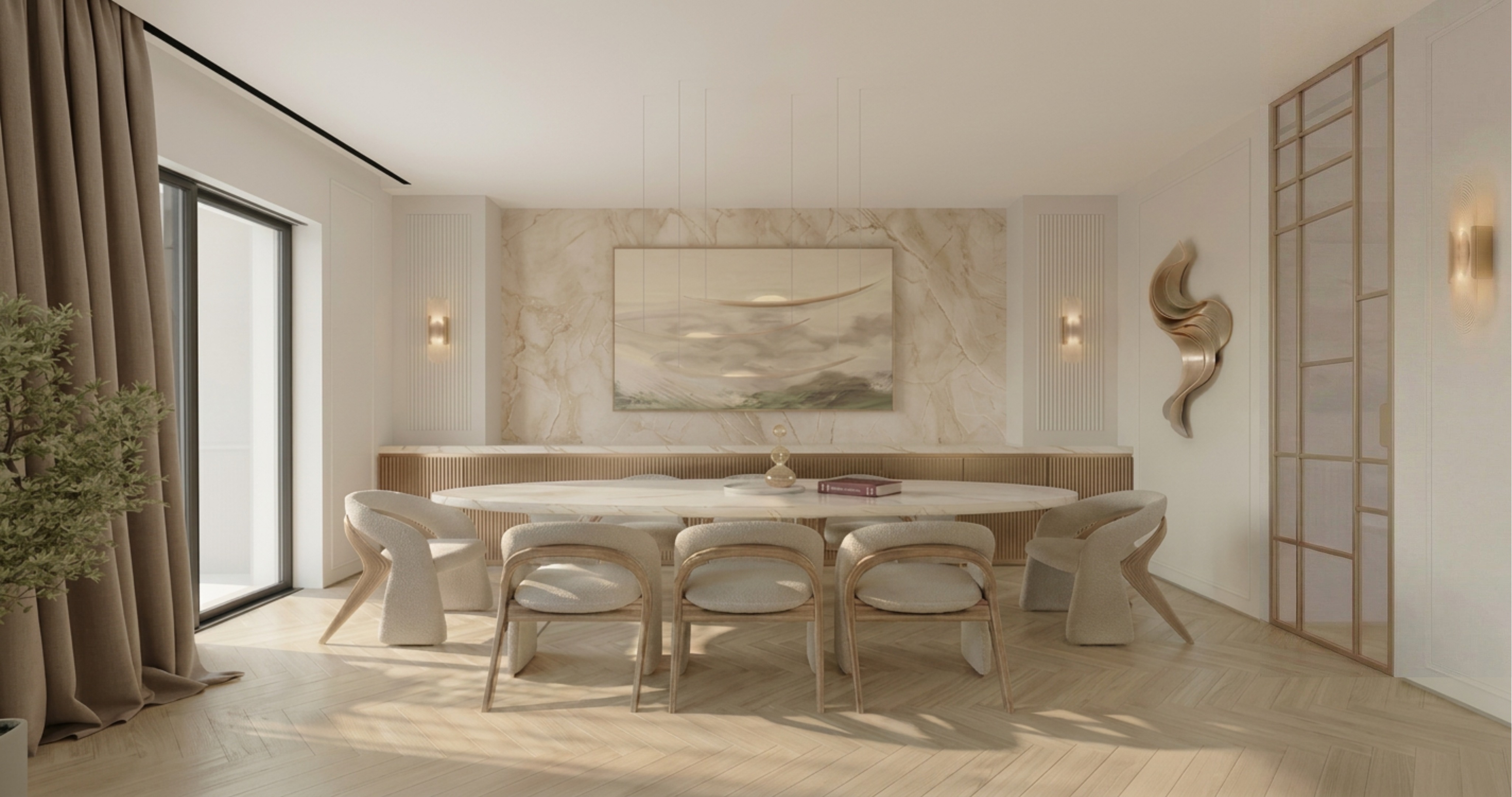 take this semi final render and enhance realism without altering any of the current image s geometry features or objects as well as image orientation no cropping zooming etc final result must be 4k do not add any new objects keep the herringbone pattern exactly as is but increase the tonal variation between individual planks each stave should have a distinct natural shade ranging from light sand to muted beige change the surface to an ultramatte raw timber texture with visible open grain removing all artificial sheen or plastic like smoothness the goal is to see a clear organic contrast in color from one tile to the next emphasizing its wooden nature yet making the effect visible yet delicate and so it doesnt stand out too much the goal is for the change from the original to be subtle as for the materials though its important to make them clear and visible we are aiming to respect the softness and elegance of the composition as a whole for that reason no exaggerated contrasts or saturations are welcomed here mind you the door was collaged into the composition which means you might need to slightly adjust the flooring and junction with the wall s finish recessed baseboard as well as the floor tiles near the door as a part of it is also part of the collage the goal is for the composition to look realistic result must be elegant clear yet soft with soft lighting too and no rough contrasts high res 4k for client viewing