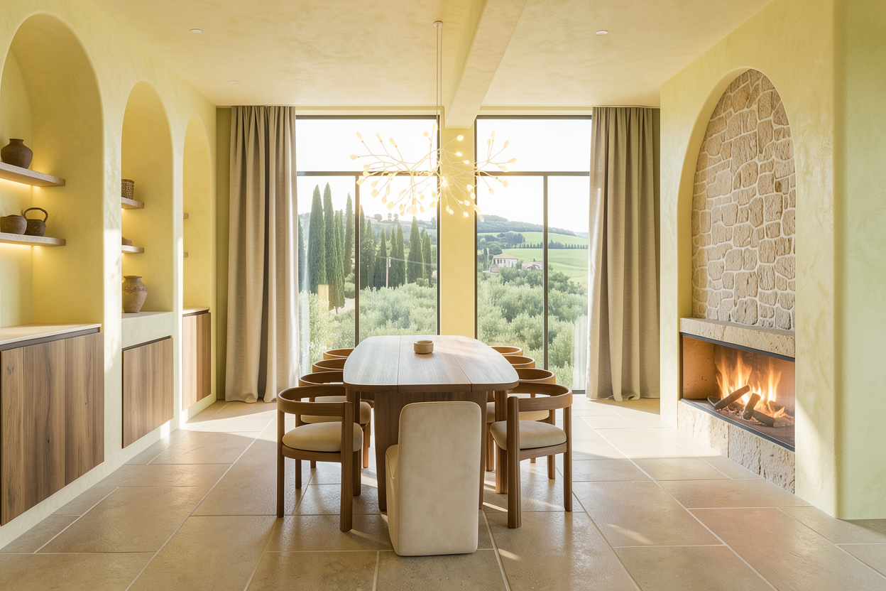 make the image look like a professional photograph in terms of lighting colors and contrast with maximum realism use the existing lime plaster texture on the walls and ceilings everywhere realistic stone cladding on top of the fireplace use the details textures and colors from the photo do not change the architecture colors and materials of the interior do not change the stone slabs on the floor make the curtains realistic make the two chandeliers above the dining table realistic in appearance based on the original model in the image which is the heracleum iii suspended large in white make them glow improve the panorama behind the windows with a more realistic one by adding low green hills typical of tuscany in the distance behind the windows with cypresses and lots of greenery add some decorative objects in a minimalist style on the shelves in the arches in the kitchen area on the left side of the image all the walls and ceilings should be in the same color and texture namely warm white lime plaster do not change the colors and materials of the entire interior keep the existing colors and textures keep the colors of the walls do not add additional lighting fixtures other than those that already exist in the image make the image in 4k