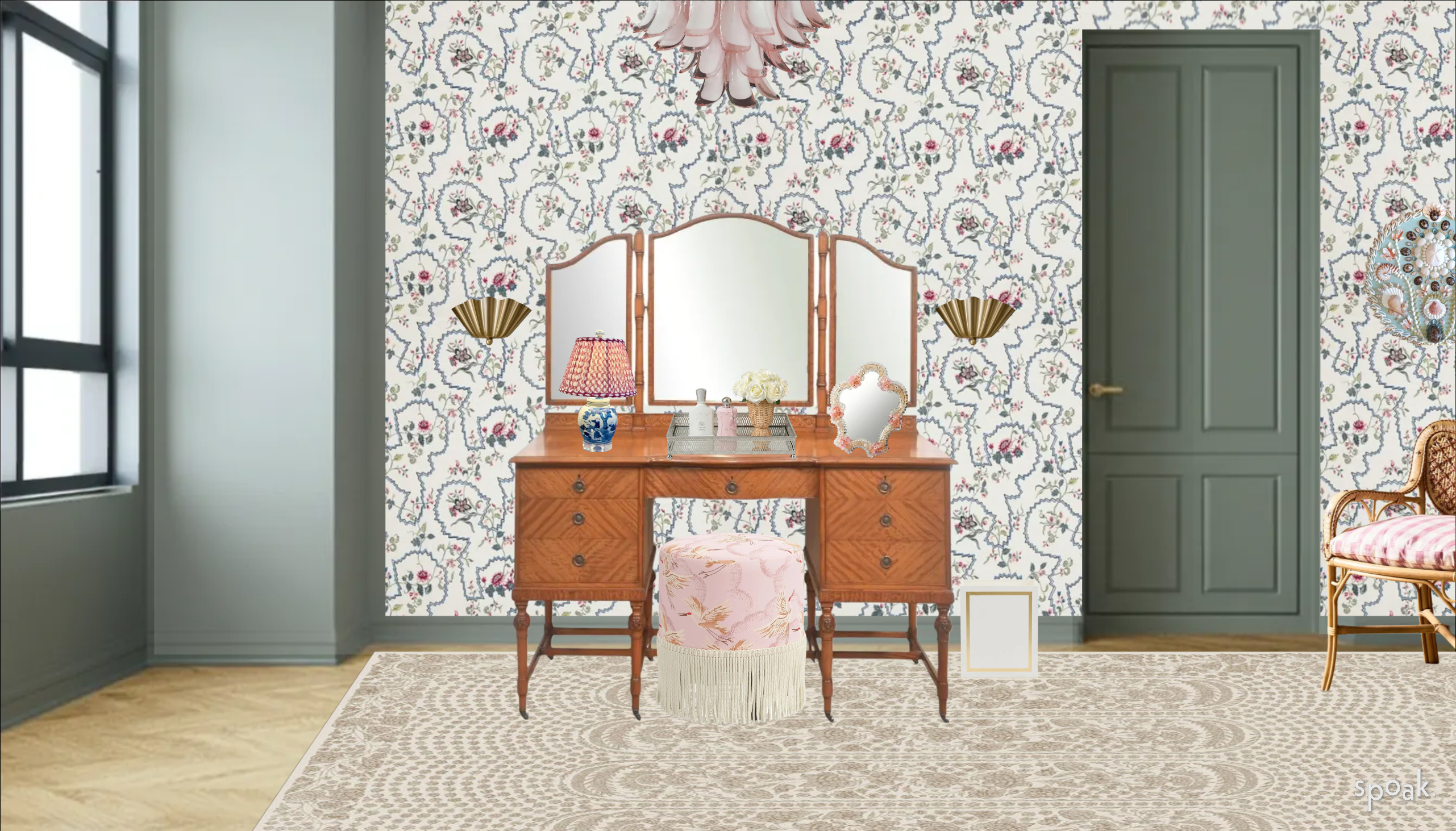 photographic realism enhancement pass only do not alter redesign replace restyle recolor or reinterpret any objects furniture artwork patterns wallpaper textiles or decor preserve all geometry proportions placement colors materials and patterns exactly as shown add editorial architectural photography lighting only introduce soft directional natural light from one side choose realistic window direction subtle shadow falloff contact shadows beneath all objects gravity based grounding accurate occlusion in corners and where objects meet surfaces enhance material realism through micro texture only fabric weave visibility subtle surface imperfections natural specular highlights on glass and metal realistic reflection behavior in mirrors add depth through atmospheric perspective and subtle lens depth of field medium format camera realism maintain true to life color accuracy no saturation increase no styling changes output should resemble high end architectural digest editorial photography