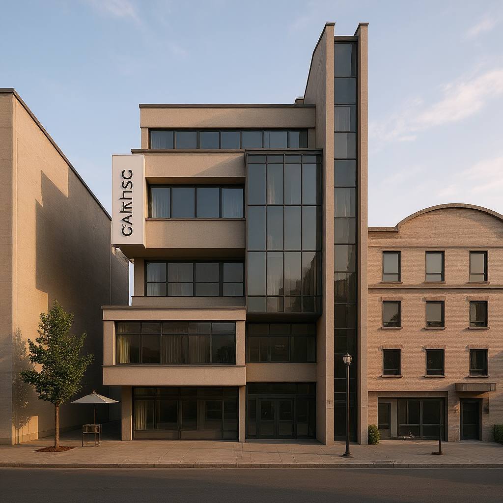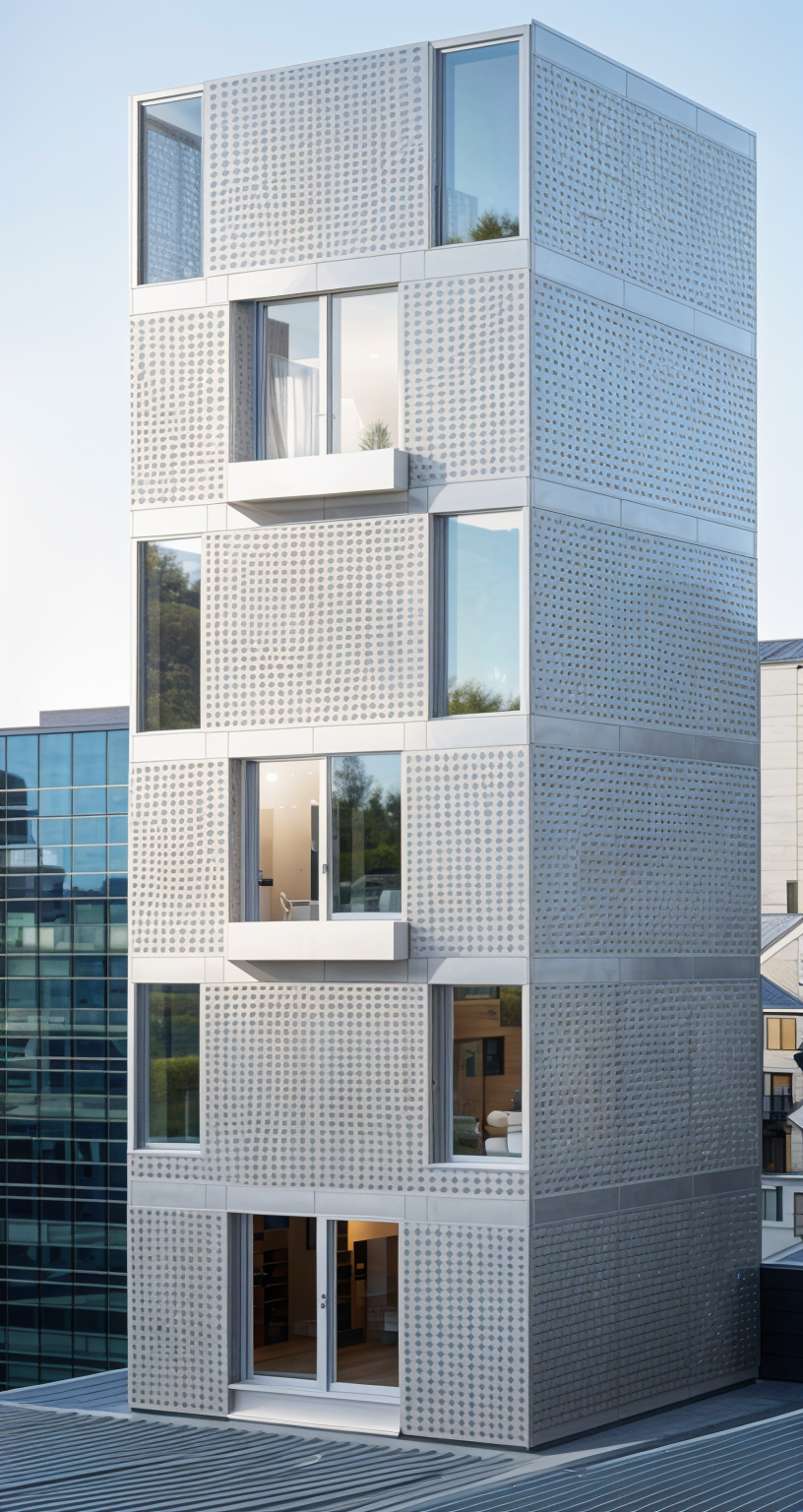 photorealistic render modern retail store brown stucco walls natural wood cladding dark gray metal roof large glass windows concrete sidewalk warm ambient light maintain the material architecture