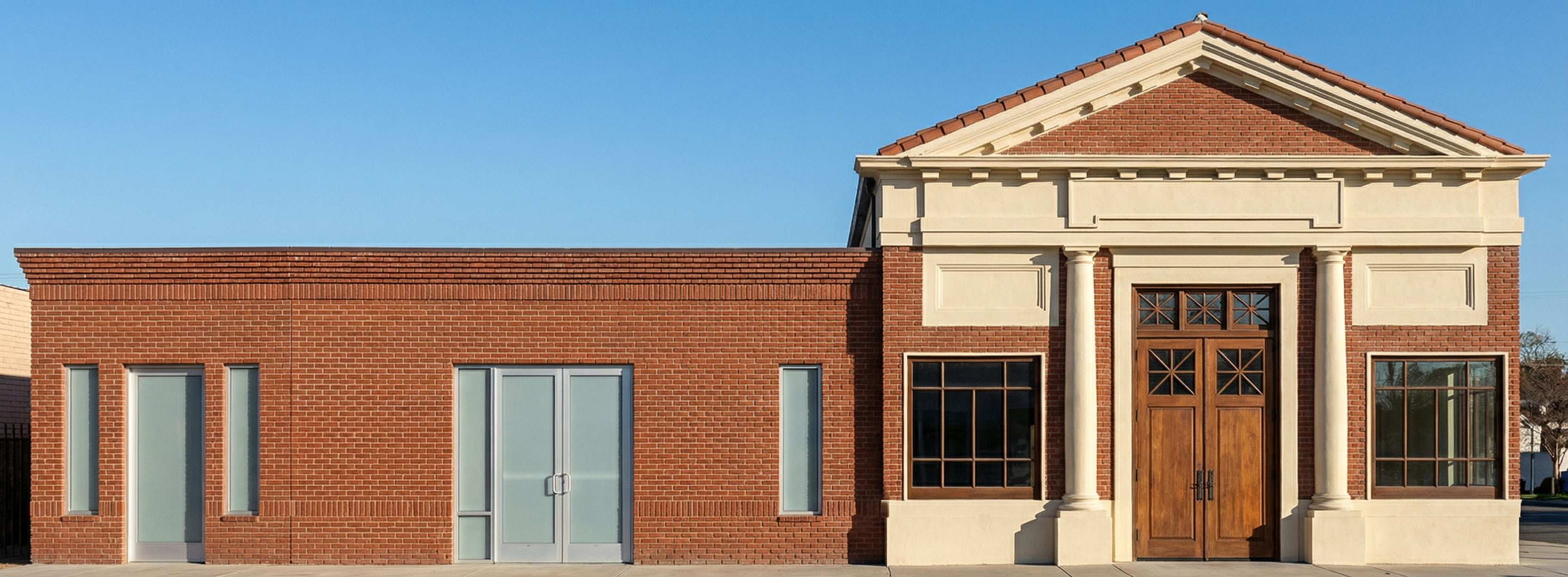 brick building with stucco entablature frosted windows on left addition only