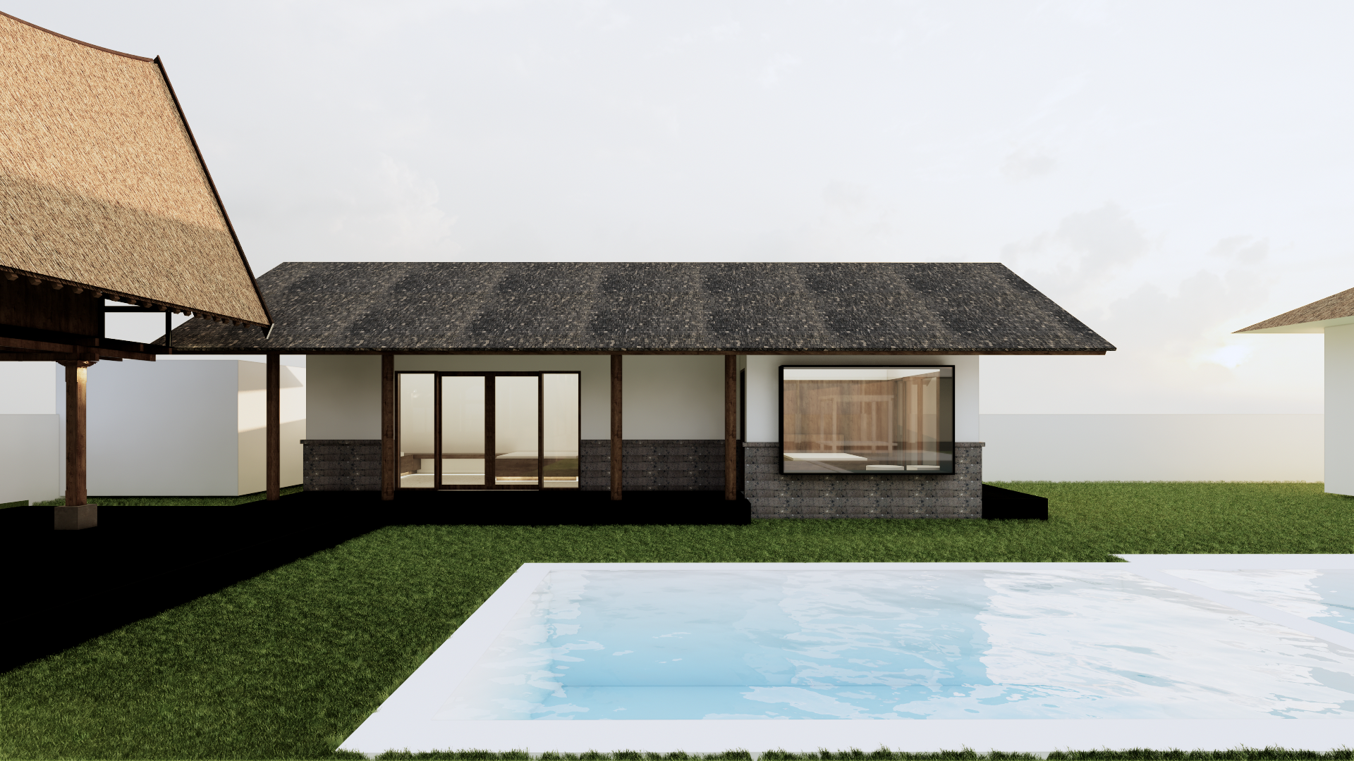 maintain the existing building swimming pool size and type contemporary tropical courtyard in early morning with visible dew on leaves soft golden sunrise filtering through dense canopy light humid haze creating depth architecture minimalist rectilinear pavilion with smooth warm gray plaster walls dark basalt stone base deep overhangs slim black steel frames large glass openings reflecting greenery calm grounded geometry landscape layered tropical planting ferns monstera banana leaves colocasia creeping groundcover moss between large floating stone slabs curated density with controlled negative space stepping pads over shallow reflective pond with lily pads and subtle koi movement water elements linear basalt reflecting pool thin blade wall fountain small moss edged cascade water surface calm with gentle ripples from falling droplets ground treatment oversized stone slabs fine gravel joints soft moss transitions teak decking accents atmosphere intimate immersive serene dew catching light on leaf edges soft shadow patterns across plaster walls slight mist diffusion for cinematic depth color palette deep tropical greens charcoal stone muted earth tones warm gray plaster camera style architectural photography eye level perspective shallow depth of field ultra realistic texture detail natural color grading mood keywords serene tropical sanctuary modern courtyard retreat morning ritual atmosphere water and foliage harmony contemplative garden space