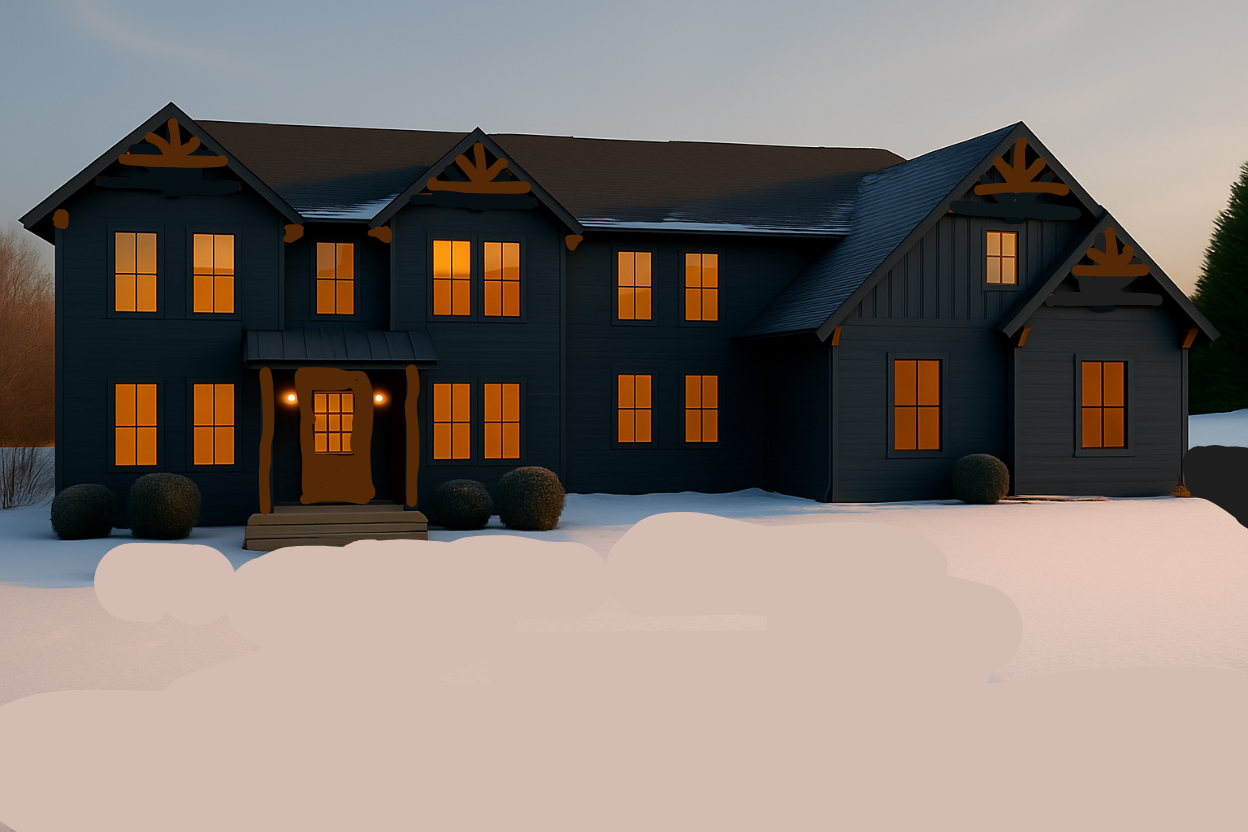 exterior shot remove the footprints in the snow make the wooden decorations at the peaks much smaller dark blue siding