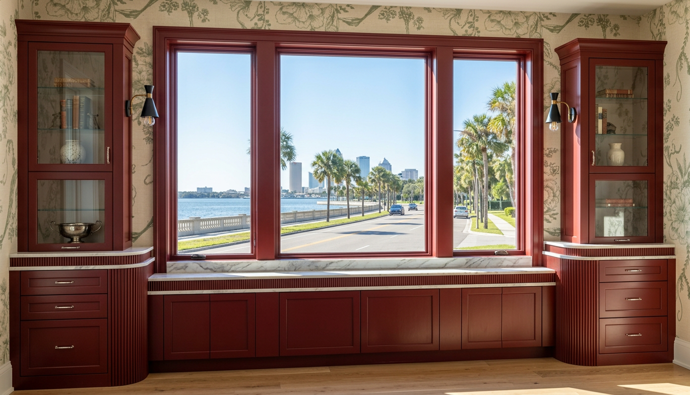 the cabinet paint is dark red the countertop is a reeded countertop sandwiched in between 2 2cm countertops the curved pilasters have vertical reedeing the window looks out onto bayshore blvd in tampa florida