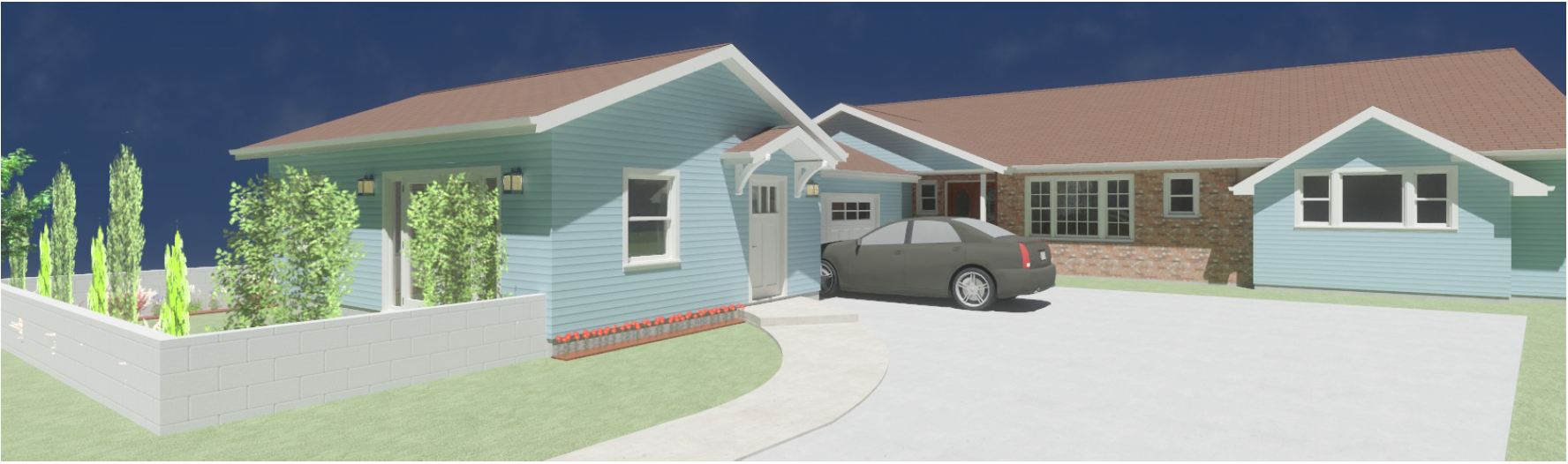 replace the existing adu with a smaller adu addition that makes it look like a 3 car garage and follows the existing roofline get rid of the patio area as well
