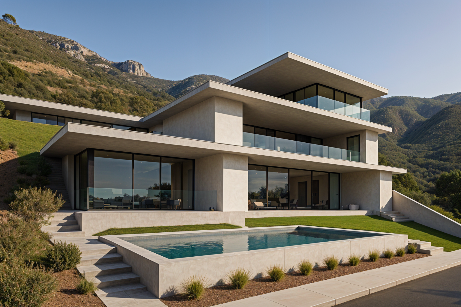 a modern hillside house in pacific palisades ca with smooth white plaster walls wood siding accents steel framing expansive glass glass railings infinity swimming pool and california native landscape with modern houses in the sides and background neighbors