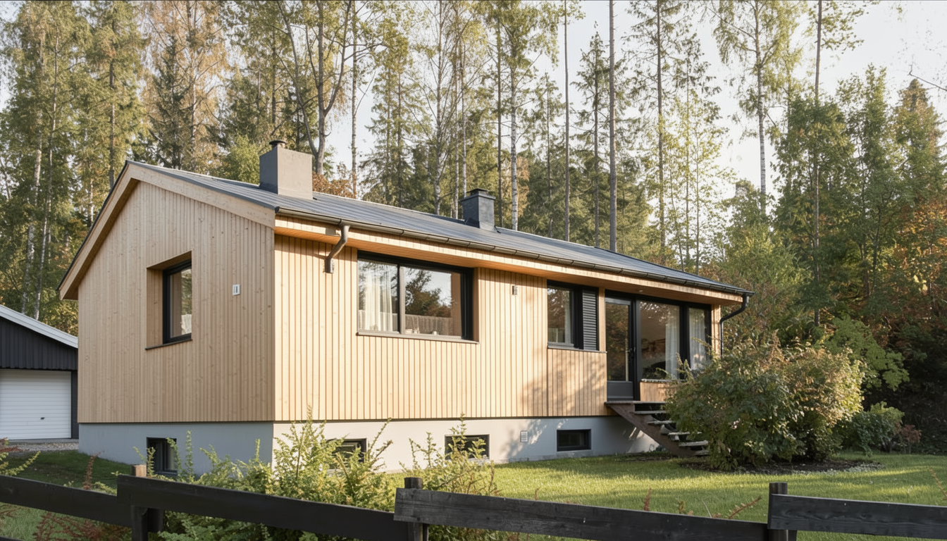 complete architectural transformation of an outdated house into modern scandinavian design redesign facade remove old details add larger windows vertical wooden cladding black window frames clean minimalistic lines improved proportions photorealistic architectural visualization realistic lighting