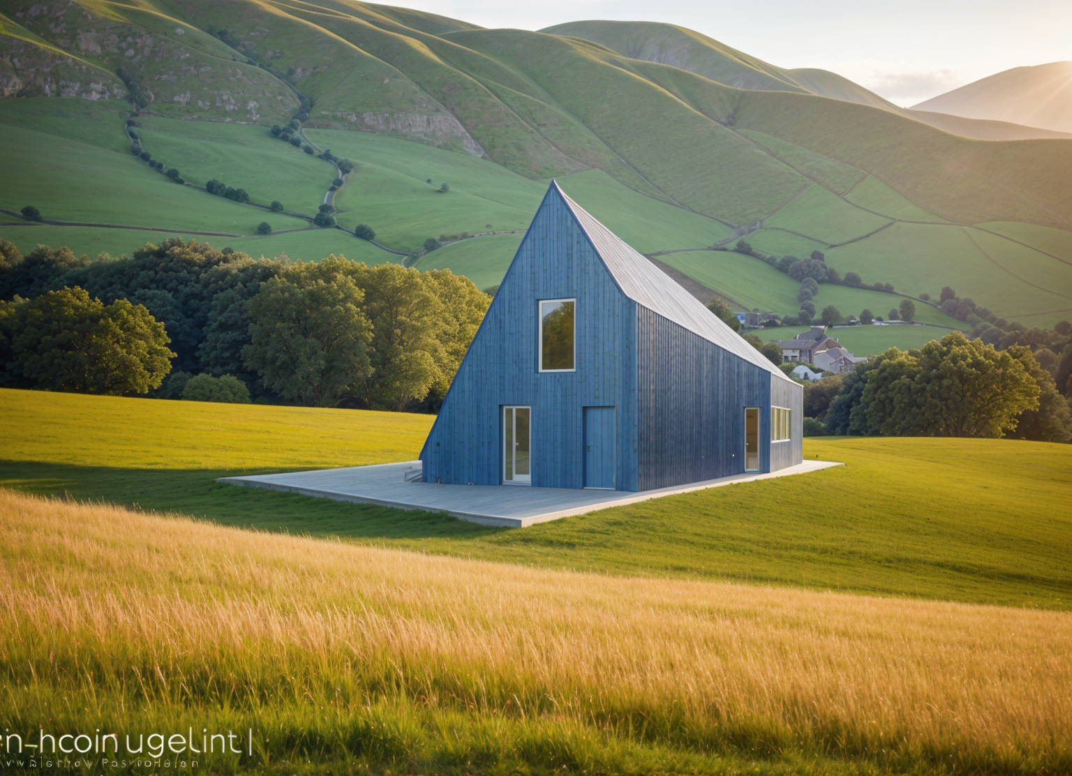 cottage with facade made of corrugated sheet metal on meadow in valley with hills in background architecture