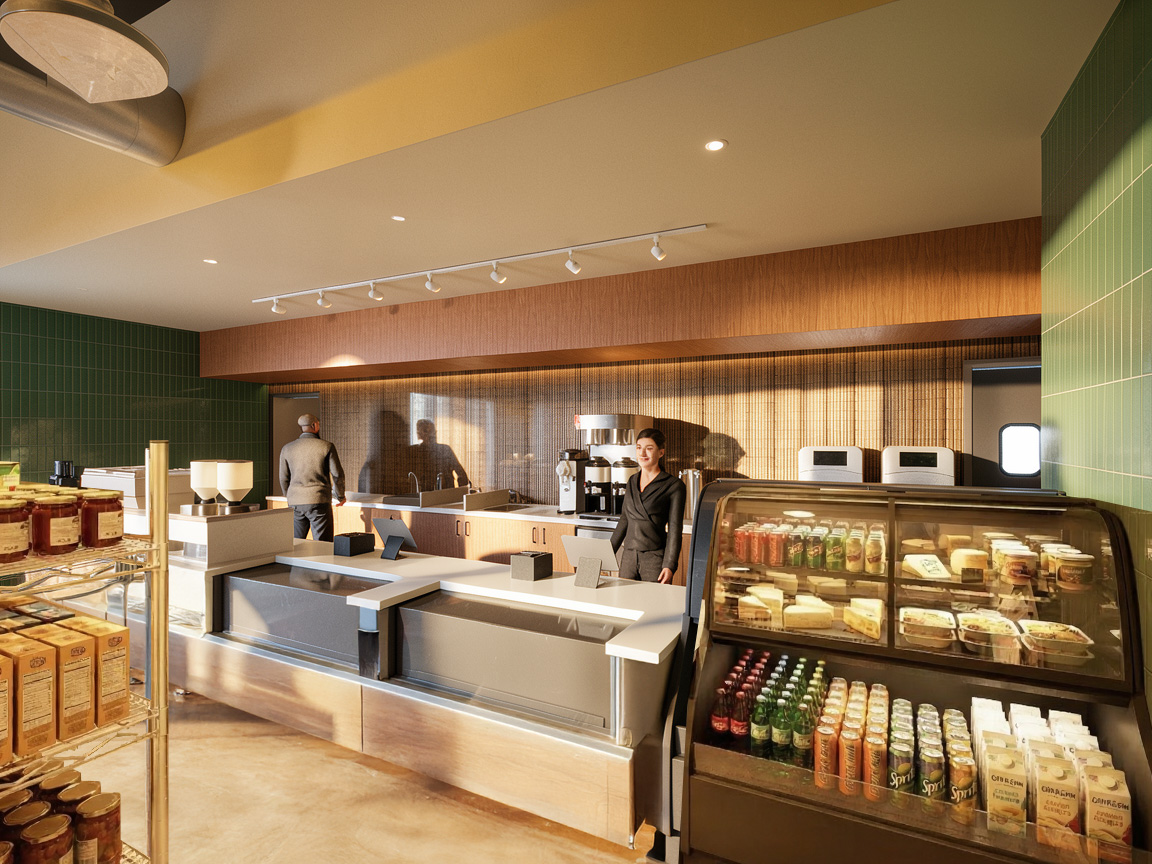 maintain materials design and proportions of input image improve overall lighting make feel like a coffee shop remove reflections from gray tile wall